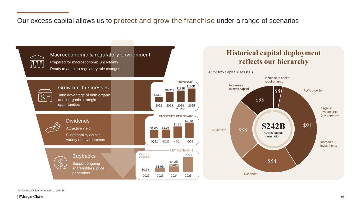 Our excess capital allows us to protect and grow the franchise under a range of scenarios Historical capital deployment reflects our hierarchy $132B $162B $173B $186B 2022 2023 2024 2025 REVENUE1 Buybacks Support ongoing shareholders, price dependent Grow our businesses Take advantage of both organic and inorganic strategic opportunities Macroeconomic & regulatory environment Prepared for macroeconomic uncertainty Ready to adapt to regulatory rule changes Dividends Attractive yield Sustainability across variety of environments $1.00 $1.05 $1.25 $1.50 4Q22 4Q23 4Q24 4Q25 DIVIDENDS PER SHARE NET BUYBACKS Quarterly averages $0.3B $1.9B $7.5B 2022 2023 2024 2025 $4.2B Visa3 ex. Visa2 $8 $91 $54 $56 $33 Organic investments (via expense) Dividends9 Buybacks6 Increase in excess capital Increase in capital requirements $242B Gross capital generation7 Inorganic investments RWA growth5 For footnoted information, refer to slide 26 2022-2025 Capital uses ($B)4 8 15