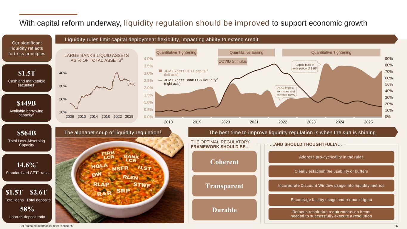 With capital reform underway, liquidity regulation should be improved to support economic growth Liquidity rules limit capital deployment flexibility, impacting ability to extend credit …AND SHOULD THOUGHTFULLY… THE OPTIMAL REGULATORY FRAMEWORK SHOULD BE… Coherent Transparent Durable JPM Excess Bank LCR liquidity5 (right axis) JPM Excess CET1 capital4 (left axis) 34% 10% 20% 30% 40% 2006 2010 2014 2018 2022 2025 Address pro-cyclicality in the rules Clearly establish the usability of buffers Incorporate Discount Window usage into liquidity metrics Encourage facility usage and reduce stigma Refocus resolution requirements on items needed to successfully execute a resolution LARGE BANKS LIQUID ASSETS AS % OF TOTAL ASSETS3 Quantitative Tightening Quantitative Tightening COVID Stimulus Quantitative Easing AOCI impact from rates and elevated RWA Capital build in anticipation of B3E6 Our significant liquidity reflects fortress principles $449B Available borrowing capacity2 $1.5T Cash and marketable securities1 $564B Total Loss-Absorbing Capacity 14.6%7 Standardized CET1 ratio $2.6T Total deposits $1.5T Total loans 58% Loan-to-deposit ratio For footnoted information, refer to slide 26 3.5% 3.0% 2.5% 2.0% 1.5% 1.0% 0.5% 0.0% 90% 80% 70% 60% 50% 40% 30% 20% 10% 0% 4.0% 2018 2019 2020 2021 2022 2023 2024 2025 The alphabet soup of liquidity regulation8 The best time to improve liquidity regulation is when the sun is shining 16