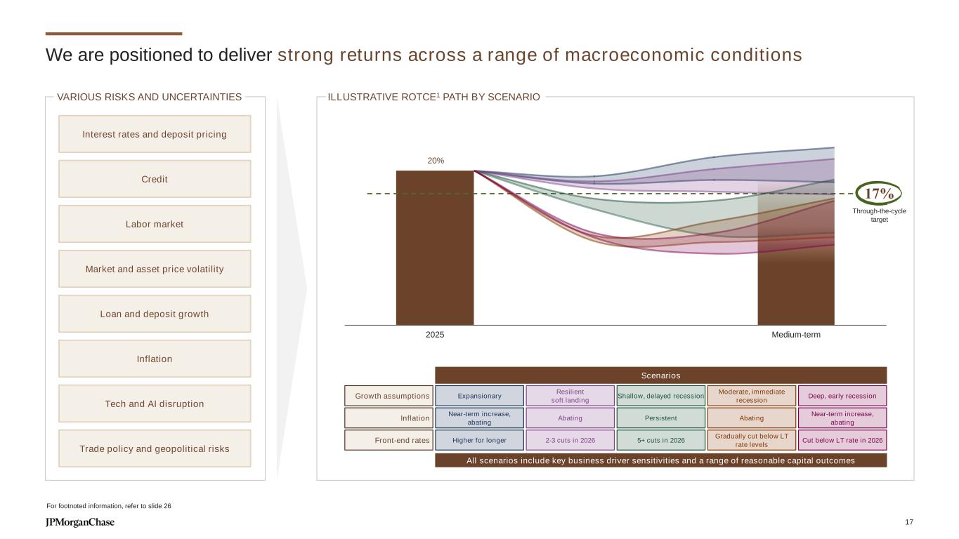 2025 Medium-term We are positioned to deliver strong returns across a range of macroeconomic conditions For footnoted information, refer to slide 26 ILLUSTRATIVE ROTCE1 PATH BY SCENARIO Scenarios All scenarios include key business driver sensitivities and a range of reasonable capital outcomes Front-end rates Inflation Growth assumptions Shallow, delayed recession 5+ cuts in 2026 Persistent Moderate, immediate recession Gradually cut below LT rate levels Abating Resilient soft landing 2-3 cuts in 2026 Abating Expansionary Higher for longer Near-term increase, abating 17% Through-the-cycle target 20% Deep, early recession Cut below LT rate in 2026 Near-term increase, abating Interest rates and deposit pricing Credit Inflation Labor market Trade policy and geopolitical risks Loan and deposit growth Tech and AI disruption Market and asset price volatility VARIOUS RISKS AND UNCERTAINTIES 17