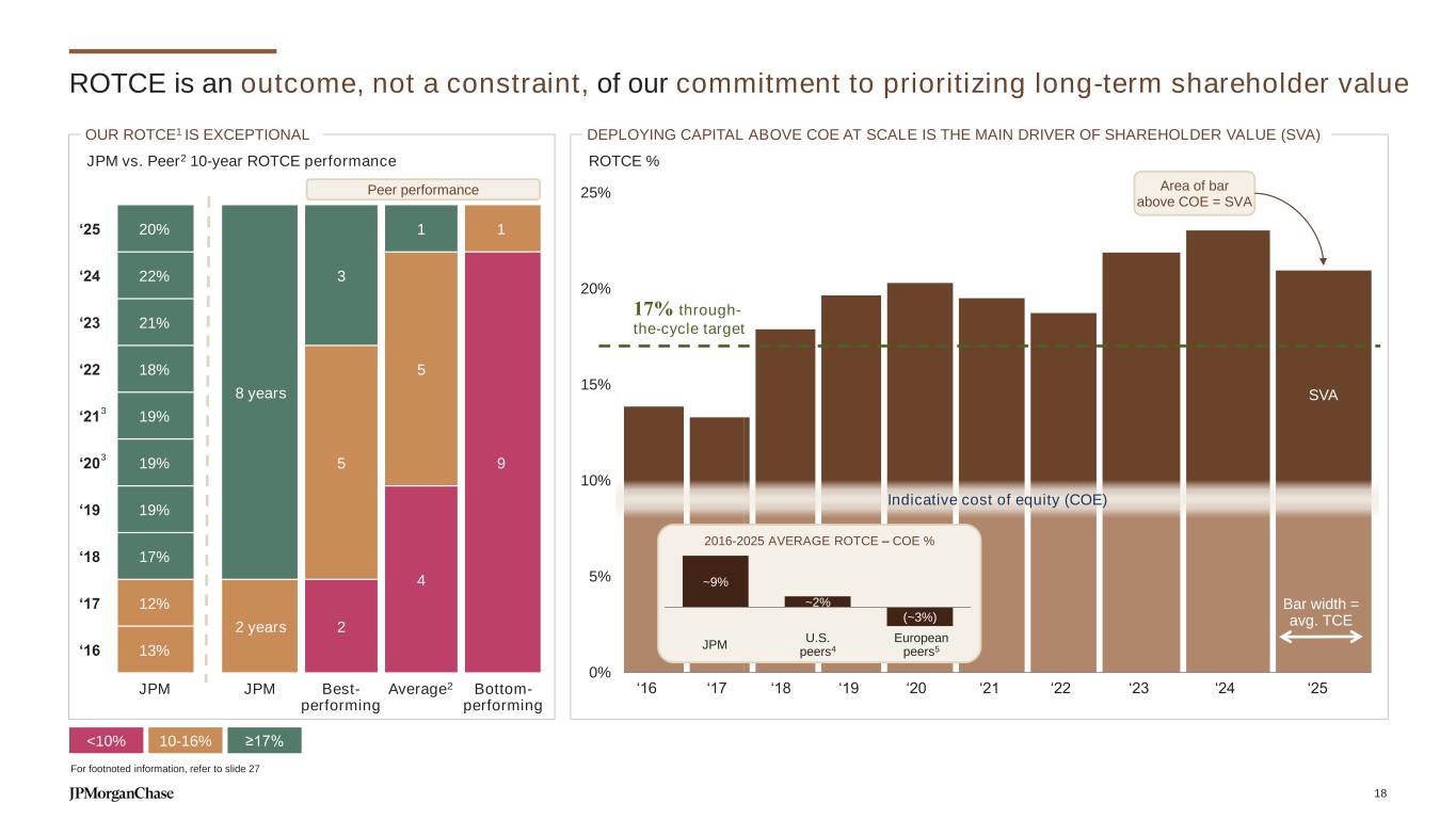 0% 5% 10% 15% 20% 25% ROTCE is an outcome, not a constraint, of our commitment to prioritizing long-term shareholder value Bar width = avg. TCE For footnoted information, refer to slide 27 8 years 3 1 1 5 95 4 2 years 2 ≥17%<10% 10-16% ‘16 ‘17 ‘18 ‘19 ‘20 ‘21 ‘22 ‘23 ‘24 ‘25 17% through- the-cycle target ROTCE % Indicative cost of equity (COE) DEPLOYING CAPITAL ABOVE COE AT SCALE IS THE MAIN DRIVER OF SHAREHOLDER VALUE (SVA) 2016-2025 AVERAGE ROTCE – COE % ~9% ~2% (~3%) European peers5 U.S. peers4JPM SVA Area of bar above COE = SVA ‘25 20% ‘24 22% ‘23 21% ‘22 18% ‘21 19% ‘20 19% ‘19 19% ‘18 17% ‘17 12% ‘16 13% JPM JPM Best- performing Bottom- performing Average2 JPM vs. Peer2 10-year ROTCE performance 3 3 OUR ROTCE1 IS EXCEPTIONAL Peer performance 18