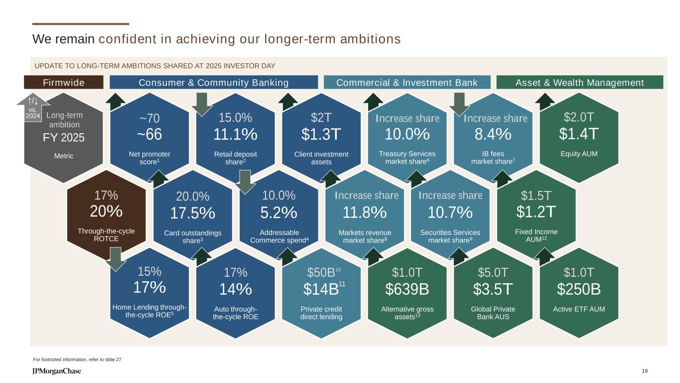 We remain confident in achieving our longer-term ambitions ~70 ~66 Net promoter score1 $2T $1.3T Client investment assets 15.0% 11.1% Retail deposit share2 8.4%10.0% $2.0T $1.4T Equity AUM . 20.0% 17.5% Card outstandings share3 (incl. `FRC) 11.8% 10.7% $1.5T $1.2T Fixed Income AUM12 $1.0T $250B Active ETF AUM . deployed15% 17% Home Lending through- the-cycle ROE5 17% 14% Auto through- the-cycle ROE $1.0T $639B Alternative gross assets13 $50B $14B Private credit direct lending $5.0T $3.5T Global Private Bank AUS Consumer & Community Banking Commercial & Investment Bank Asset & Wealth ManagementFirmwide UPDATE TO LONG-TERM AMBITIONS SHARED AT 2025 INVESTOR DAY For footnoted information, refer to slide 27 17% 20% Through-the-cycle ROTCE Metric Long-term ambition FY 2025 ↑/↓ vs. 2024 Increase share Treasury Services market share6 10.0% Increase share IB fees market share7 Increase share Markets revenue market share8 Increase share Securities Services market share9 11 5.2% Addressable Commerce spend4 10 19
