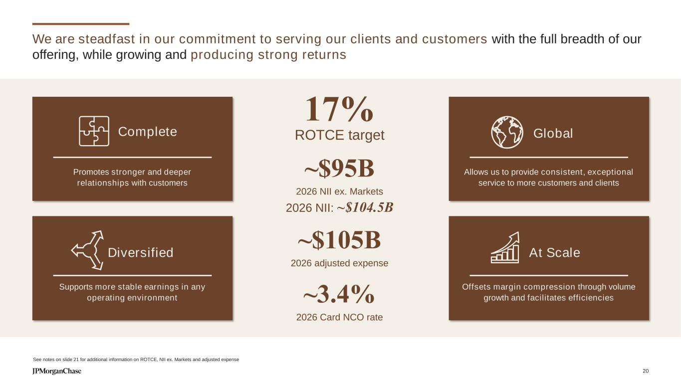 We are steadfast in our commitment to serving our clients and customers with the full breadth of our offering, while growing and producing strong returns Promotes stronger and deeper relationships with customers Allows us to provide consistent, exceptional service to more customers and clients Supports more stable earnings in any operating environment Offsets margin compression through volume growth and facilitates efficiencies Complete Global Diversified At Scale See notes on slide 21 for additional information on ROTCE, NII ex. Markets and adjusted expense ~$95B 2026 NII ex. Markets 2026 NII: ~$104.5B ~$105B 2026 adjusted expense 17% ROTCE target ~3.4% 2026 Card NCO rate 20