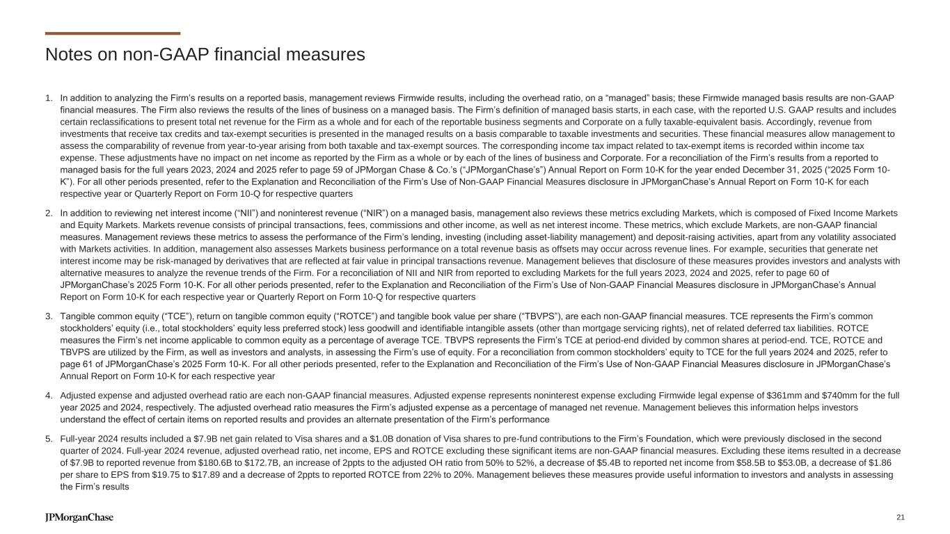 Notes on non-GAAP financial measures 1. In addition to analyzing the Firm’s results on a reported basis, management reviews Firmwide results, including the overhead ratio, on a “managed” basis; these Firmwide managed basis results are non-GAAP financial measures. The Firm also reviews the results of the lines of business on a managed basis. The Firm’s definition of managed basis starts, in each case, with the reported U.S. GAAP results and includes certain reclassifications to present total net revenue for the Firm as a whole and for each of the reportable business segments and Corporate on a fully taxable-equivalent basis. Accordingly, revenue from investments that receive tax credits and tax-exempt securities is presented in the managed results on a basis comparable to taxable investments and securities. These financial measures allow management to assess the comparability of revenue from year-to-year arising from both taxable and tax-exempt sources. The corresponding income tax impact related to tax-exempt items is recorded within income tax expense. These adjustments have no impact on net income as reported by the Firm as a whole or by each of the lines of business and Corporate. For a reconciliation of the Firm’s results from a reported to managed basis for the full years 2023, 2024 and 2025 refer to page 59 of JPMorgan Chase & Co.’s (“JPMorganChase’s”) Annual Report on Form 10-K for the year ended December 31, 2025 (“2025 Form 10- K”). For all other periods presented, refer to the Explanation and Reconciliation of the Firm’s Use of Non-GAAP Financial Measures disclosure in JPMorganChase’s Annual Report on Form 10-K for each respective year or Quarterly Report on Form 10-Q for respective quarters 2. In addition to reviewing net interest income (“NII”) and noninterest revenue (“NIR”) on a managed basis, management also reviews these metrics excluding Markets, which is composed of Fixed Income Markets and Equity Markets. Markets revenue consists of principal transactions, fees, commissions and other income, as well as net interest income. These metrics, which exclude Markets, are non-GAAP financial measures. Management reviews these metrics to assess the performance of the Firm’s lending, investing (including asset-liability management) and deposit-raising activities, apart from any volatility associated with Markets activities. In addition, management also assesses Markets business performance on a total revenue basis as offsets may occur across revenue lines. For example, securities that generate net interest income may be risk-managed by derivatives that are reflected at fair value in principal transactions revenue. Management believes that disclosure of these measures provides investors and analysts with alternative measures to analyze the revenue trends of the Firm. For a reconciliation of NII and NIR from reported to excluding Markets for the full years 2023, 2024 and 2025, refer to page 60 of JPMorganChase’s 2025 Form 10-K. For all other periods presented, refer to the Explanation and Reconciliation of the Firm’s Use of Non-GAAP Financial Measures disclosure in JPMorganChase’s Annual Report on Form 10-K for each respective year or Quarterly Report on Form 10-Q for respective quarters 3. Tangible common equity (“TCE”), return on tangible common equity (“ROTCE”) and tangible book value per share (“TBVPS”), are each non-GAAP financial measures. TCE represents the Firm’s common stockholders’ equity (i.e., total stockholders’ equity less preferred stock) less goodwill and identifiable intangible assets (other than mortgage servicing rights), net of related deferred tax liabilities. ROTCE measures the Firm’s net income applicable to common equity as a percentage of average TCE. TBVPS represents the Firm’s TCE at period-end divided by common shares at period-end. TCE, ROTCE and TBVPS are utilized by the Firm, as well as investors and analysts, in assessing the Firm’s use of equity. For a reconciliation from common stockholders’ equity to TCE for the full years 2024 and 2025, refer to page 61 of JPMorganChase’s 2025 Form 10-K. For all other periods presented, refer to the Explanation and Reconciliation of the Firm’s Use of Non-GAAP Financial Measures disclosure in JPMorganChase’s Annual Report on Form 10-K for each respective year 4. Adjusted expense and adjusted overhead ratio are each non-GAAP financial measures. Adjusted expense represents noninterest expense excluding Firmwide legal expense of $361mm and $740mm for the full year 2025 and 2024, respectively. The adjusted overhead ratio measures the Firm’s adjusted expense as a percentage of managed net revenue. Management believes this information helps investors understand the effect of certain items on reported results and provides an alternate presentation of the Firm’s performance 5. Full-year 2024 results included a $7.9B net gain related to Visa shares and a $1.0B donation of Visa shares to pre-fund contributions to the Firm’s Foundation, which were previously disclosed in the second quarter of 2024. Full-year 2024 revenue, adjusted overhead ratio, net income, EPS and ROTCE excluding these significant items are non-GAAP financial measures. Excluding these items resulted in a decrease of $7.9B to reported revenue from $180.6B to $172.7B, an increase of 2ppts to the adjusted OH ratio from 50% to 52%, a decrease of $5.4B to reported net income from $58.5B to $53.0B, a decrease of $1.86 per share to EPS from $19.75 to $17.89 and a decrease of 2ppts to reported ROTCE from 22% to 20%. Management believes these measures provide useful information to investors and analysts in assessing the Firm’s results 21