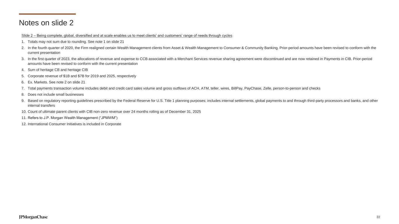 Notes on slide 2 Slide 2 – Being complete, global, diversified and at scale enables us to meet clients’ and customers’ range of needs through cycles 1. Totals may not sum due to rounding. See note 1 on slide 21 2. In the fourth quarter of 2020, the Firm realigned certain Wealth Management clients from Asset & Wealth Management to Consumer & Community Banking. Prior-period amounts have been revised to conform with the current presentation 3. In the first quarter of 2023, the allocations of revenue and expense to CCB associated with a Merchant Services revenue sharing agreement were discontinued and are now retained in Payments in CIB. Prior-period amounts have been revised to conform with the current presentation 4. Sum of heritage CB and heritage CIB 5. Corporate revenue of $1B and $7B for 2019 and 2025, respectively 6. Ex. Markets. See note 2 on slide 21 7. Total payments transaction volume includes debit and credit card sales volume and gross outflows of ACH, ATM, teller, wires, BillPay, PayChase, Zelle, person-to-person and checks 8. Does not include small businesses 9. Based on regulatory reporting guidelines prescribed by the Federal Reserve for U.S. Title 1 planning purposes; includes internal settlements, global payments to and through third-party processors and banks, and other internal transfers 10. Count of ultimate parent clients with CIB non-zero revenue over 24 months rolling as of December 31, 2025 11. Refers to J.P. Morgan Wealth Management (“JPMWM”) 12. International Consumer Initiatives is included in Corporate 22