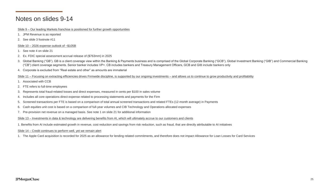 Notes on slides 9-14 Slide 9 – Our leading Markets franchise is positioned for further growth opportunities 1. JPM Revenue is as reported 2. See slide 3 footnote #11 Slide 10 – 2026 expense outlook of ~$105B 1. See note 4 on slide 21 2. Ex. FDIC special assessment accrual release of ($763mm) in 2025 3. Global Banking (“GB”). GB is a client coverage view within the Banking & Payments business and is comprised of the Global Corporate Banking (“GCB”), Global Investment Banking (“GIB”) and Commercial Banking (“CB”) client coverage segments. Senior banker includes VP+. CB includes bankers and Treasury Management Officers, GCB and GIB include bankers only 4. Corporate is excluded from “Real estate and other” as amounts are immaterial Slide 11 – Focusing on extracting efficiencies drives Firmwide discipline, is supported by our ongoing investments – and allows us to continue to grow productivity and profitability 1. Associated with CCB 2. FTE refers to full-time employees 3. Represents total fraud-related losses and direct expenses, measured in cents per $100 in sales volume 4. Includes all core operations direct expense related to processing statements and payments for the Firm 5. Screened transactions per FTE is based on a comparison of total annual screened transactions and related FTEs (12-month average) in Payments 6. Cash equities unit cost is based on a comparison of full-year volumes and CIB Technology and Operations allocated expenses 7. Pre-provision net revenue on a managed basis. See note 1 on slide 21 for additional information Slide 13 – Investments in data & technology are delivering benefits from AI, which will ultimately accrue to our customers and clients 1. Benefits from AI include estimated growth in revenue, cost reduction and savings from risk reduction, such as fraud, that are directly attributable to AI initiatives Slide 14 – Credit continues to perform well, yet we remain alert 1. The Apple Card acquisition is recorded for 2025 as an allowance for lending related commitments, and therefore does not impact Allowance for Loan Losses for Card Services 25