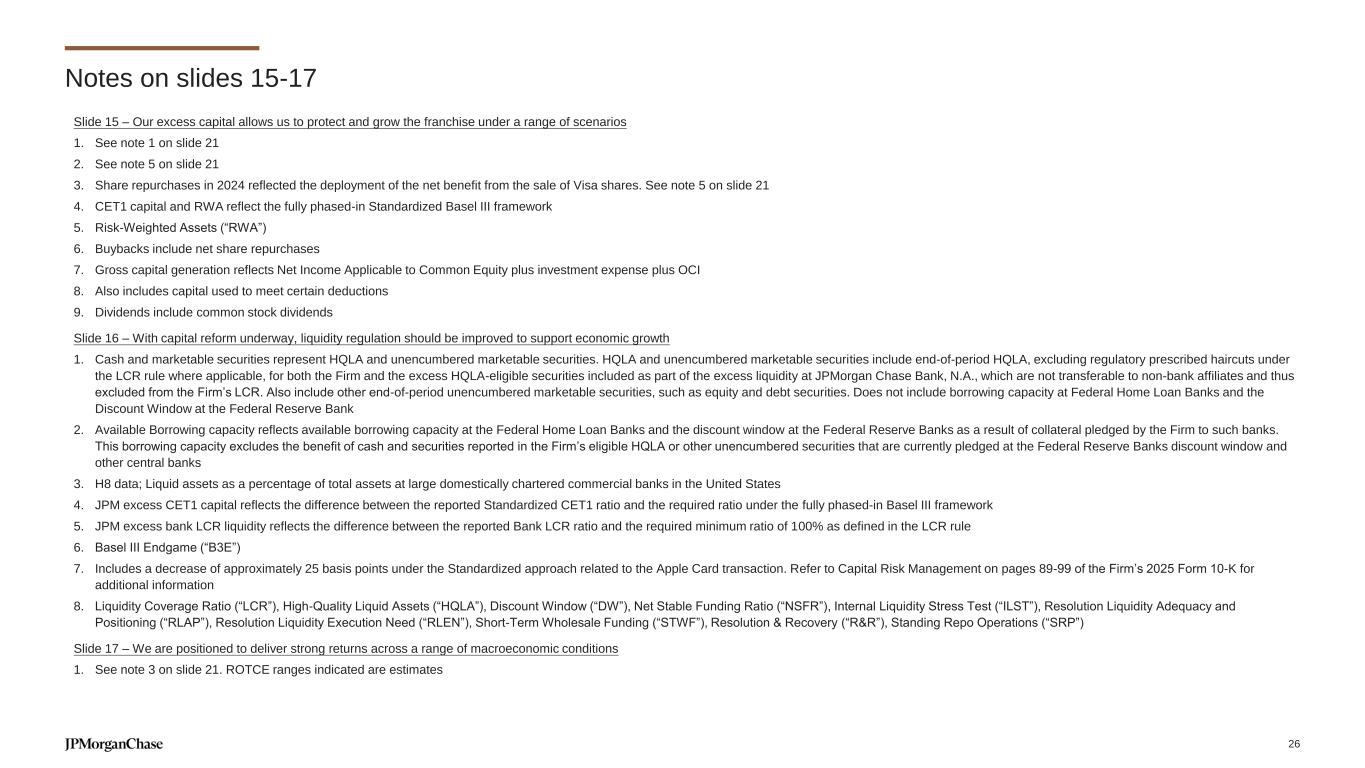 Notes on slides 15-17 Slide 15 – Our excess capital allows us to protect and grow the franchise under a range of scenarios 1. See note 1 on slide 21 2. See note 5 on slide 21 3. Share repurchases in 2024 reflected the deployment of the net benefit from the sale of Visa shares. See note 5 on slide 21 4. CET1 capital and RWA reflect the fully phased-in Standardized Basel III framework 5. Risk-Weighted Assets (“RWA”) 6. Buybacks include net share repurchases 7. Gross capital generation reflects Net Income Applicable to Common Equity plus investment expense plus OCI 8. Also includes capital used to meet certain deductions 9. Dividends include common stock dividends Slide 16 – With capital reform underway, liquidity regulation should be improved to support economic growth 1. Cash and marketable securities represent HQLA and unencumbered marketable securities. HQLA and unencumbered marketable securities include end-of-period HQLA, excluding regulatory prescribed haircuts under the LCR rule where applicable, for both the Firm and the excess HQLA-eligible securities included as part of the excess liquidity at JPMorgan Chase Bank, N.A., which are not transferable to non-bank affiliates and thus excluded from the Firm’s LCR. Also include other end-of-period unencumbered marketable securities, such as equity and debt securities. Does not include borrowing capacity at Federal Home Loan Banks and the Discount Window at the Federal Reserve Bank 2. Available Borrowing capacity reflects available borrowing capacity at the Federal Home Loan Banks and the discount window at the Federal Reserve Banks as a result of collateral pledged by the Firm to such banks. This borrowing capacity excludes the benefit of cash and securities reported in the Firm’s eligible HQLA or other unencumbered securities that are currently pledged at the Federal Reserve Banks discount window and other central banks 3. H8 data; Liquid assets as a percentage of total assets at large domestically chartered commercial banks in the United States 4. JPM excess CET1 capital reflects the difference between the reported Standardized CET1 ratio and the required ratio under the fully phased-in Basel III framework 5. JPM excess bank LCR liquidity reflects the difference between the reported Bank LCR ratio and the required minimum ratio of 100% as defined in the LCR rule 6. Basel III Endgame (“B3E”) 7. Includes a decrease of approximately 25 basis points under the Standardized approach related to the Apple Card transaction. Refer to Capital Risk Management on pages 89-99 of the Firm’s 2025 Form 10-K for additional information 8. Liquidity Coverage Ratio (“LCR”), High-Quality Liquid Assets (“HQLA”), Discount Window (“DW”), Net Stable Funding Ratio (“NSFR”), Internal Liquidity Stress Test (“ILST”), Resolution Liquidity Adequacy and Positioning (“RLAP”), Resolution Liquidity Execution Need (“RLEN”), Short-Term Wholesale Funding (“STWF”), Resolution & Recovery (“R&R”), Standing Repo Operations (“SRP”) Slide 17 – We are positioned to deliver strong returns across a range of macroeconomic conditions 1. See note 3 on slide 21. ROTCE ranges indicated are estimates 26
