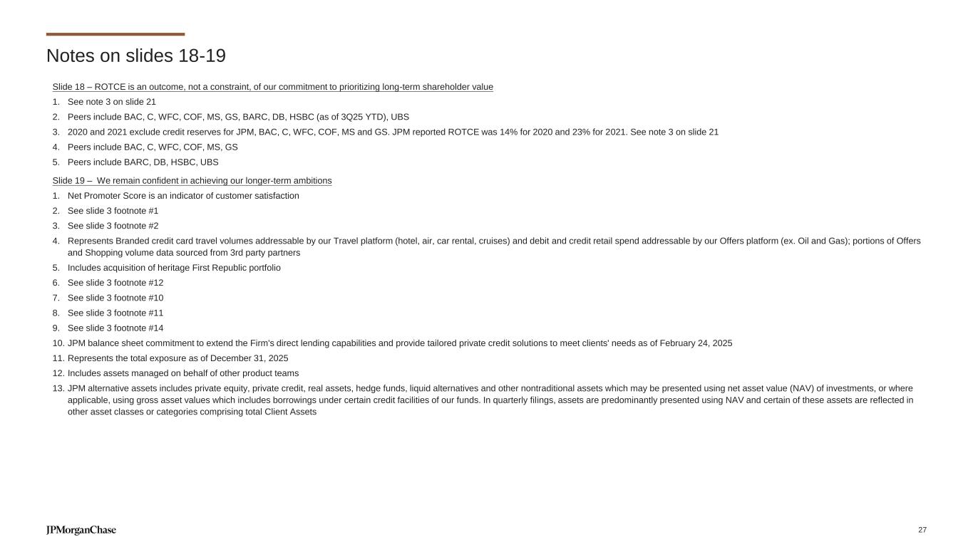 Notes on slides 18-19 Slide 18 – ROTCE is an outcome, not a constraint, of our commitment to prioritizing long-term shareholder value 1. See note 3 on slide 21 2. Peers include BAC, C, WFC, COF, MS, GS, BARC, DB, HSBC (as of 3Q25 YTD), UBS 3. 2020 and 2021 exclude credit reserves for JPM, BAC, C, WFC, COF, MS and GS. JPM reported ROTCE was 14% for 2020 and 23% for 2021. See note 3 on slide 21 4. Peers include BAC, C, WFC, COF, MS, GS 5. Peers include BARC, DB, HSBC, UBS Slide 19 – We remain confident in achieving our longer-term ambitions 1. Net Promoter Score is an indicator of customer satisfaction 2. See slide 3 footnote #1 3. See slide 3 footnote #2 4. Represents Branded credit card travel volumes addressable by our Travel platform (hotel, air, car rental, cruises) and debit and credit retail spend addressable by our Offers platform (ex. Oil and Gas); portions of Offers and Shopping volume data sourced from 3rd party partners 5. Includes acquisition of heritage First Republic portfolio 6. See slide 3 footnote #12 7. See slide 3 footnote #10 8. See slide 3 footnote #11 9. See slide 3 footnote #14 10. JPM balance sheet commitment to extend the Firm's direct lending capabilities and provide tailored private credit solutions to meet clients' needs as of February 24, 2025 11. Represents the total exposure as of December 31, 2025 12. Includes assets managed on behalf of other product teams 13. JPM alternative assets includes private equity, private credit, real assets, hedge funds, liquid alternatives and other nontraditional assets which may be presented using net asset value (NAV) of investments, or where applicable, using gross asset values which includes borrowings under certain credit facilities of our funds. In quarterly filings, assets are predominantly presented using NAV and certain of these assets are reflected in other asset classes or categories comprising total Client Assets 27