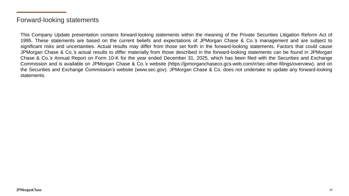 Forward-looking statements This Company Update presentation contains forward-looking statements within the meaning of the Private Securities Litigation Reform Act of 1995. These statements are based on the current beliefs and expectations of JPMorgan Chase & Co.’s management and are subject to significant risks and uncertainties. Actual results may differ from those set forth in the forward-looking statements. Factors that could cause JPMorgan Chase & Co.’s actual results to differ materially from those described in the forward-looking statements can be found in JPMorgan Chase & Co.’s Annual Report on Form 10-K for the year ended December 31, 2025, which has been filed with the Securities and Exchange Commission and is available on JPMorgan Chase & Co.’s website (https://jpmorganchaseco.gcs-web.com/ir/sec-other-filings/overview), and on the Securities and Exchange Commission’s website (www.sec.gov). JPMorgan Chase & Co. does not undertake to update any forward-looking statements. 28