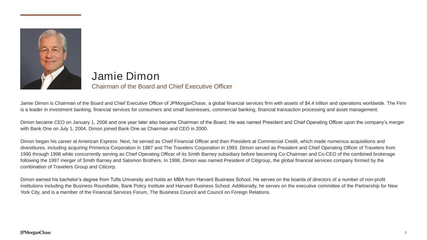 Jamie Dimon Chairman of the Board and Chief Executive Officer Jamie Dimon is Chairman of the Board and Chief Executive Officer of JPMorganChase, a global financial services firm with assets of $4.4 trillion and operations worldwide. The Firm is a leader in investment banking, financial services for consumers and small businesses, commercial banking, financial transaction processing and asset management. Dimon became CEO on January 1, 2006 and one year later also became Chairman of the Board. He was named President and Chief Operating Officer upon the company’s merger with Bank One on July 1, 2004. Dimon joined Bank One as Chairman and CEO in 2000. Dimon began his career at American Express. Next, he served as Chief Financial Officer and then President at Commercial Credit, which made numerous acquisitions and divestitures, including acquiring Primerica Corporation in 1987 and The Travelers Corporation in 1993. Dimon served as President and Chief Operating Officer of Travelers from 1990 through 1998 while concurrently serving as Chief Operating Officer of its Smith Barney subsidiary before becoming Co-Chairman and Co-CEO of the combined brokerage following the 1997 merger of Smith Barney and Salomon Brothers. In 1998, Dimon was named President of Citigroup, the global financial services company formed by the combination of Travelers Group and Citicorp. Dimon earned his bachelor’s degree from Tufts University and holds an MBA from Harvard Business School. He serves on the boards of directors of a number of non-profit institutions including the Business Roundtable, Bank Policy Institute and Harvard Business School. Additionally, he serves on the executive committee of the Partnership for New York City, and is a member of the Financial Services Forum, The Business Council and Council on Foreign Relations. 1