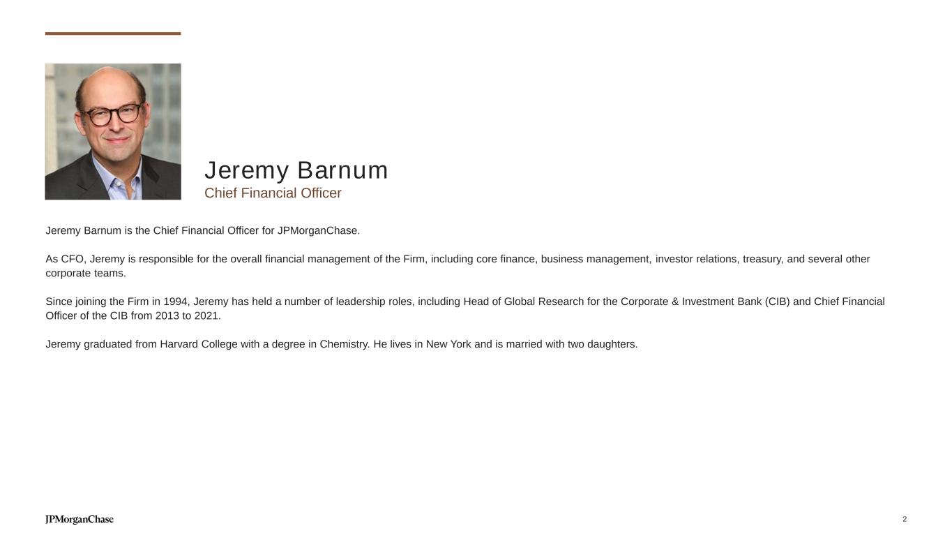 Jeremy Barnum Chief Financial Officer Jeremy Barnum is the Chief Financial Officer for JPMorganChase. As CFO, Jeremy is responsible for the overall financial management of the Firm, including core finance, business management, investor relations, treasury, and several other corporate teams. Since joining the Firm in 1994, Jeremy has held a number of leadership roles, including Head of Global Research for the Corporate & Investment Bank (CIB) and Chief Financial Officer of the CIB from 2013 to 2021. Jeremy graduated from Harvard College with a degree in Chemistry. He lives in New York and is married with two daughters. 2