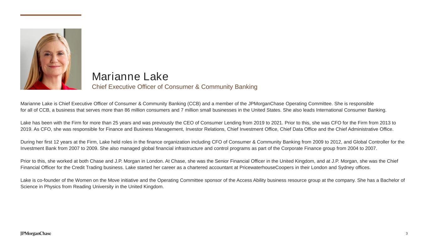 Marianne Lake Chief Executive Officer of Consumer & Community Banking Marianne Lake is Chief Executive Officer of Consumer & Community Banking (CCB) and a member of the JPMorganChase Operating Committee. She is responsible for all of CCB, a business that serves more than 86 million consumers and 7 million small businesses in the United States. She also leads International Consumer Banking. Lake has been with the Firm for more than 25 years and was previously the CEO of Consumer Lending from 2019 to 2021. Prior to this, she was CFO for the Firm from 2013 to 2019. As CFO, she was responsible for Finance and Business Management, Investor Relations, Chief Investment Office, Chief Data Office and the Chief Administrative Office. During her first 12 years at the Firm, Lake held roles in the finance organization including CFO of Consumer & Community Banking from 2009 to 2012, and Global Controller for the Investment Bank from 2007 to 2009. She also managed global financial infrastructure and control programs as part of the Corporate Finance group from 2004 to 2007. Prior to this, she worked at both Chase and J.P. Morgan in London. At Chase, she was the Senior Financial Officer in the United Kingdom, and at J.P. Morgan, she was the Chief Financial Officer for the Credit Trading business. Lake started her career as a chartered accountant at PricewaterhouseCoopers in their London and Sydney offices. Lake is co-founder of the Women on the Move initiative and the Operating Committee sponsor of the Access Ability business resource group at the company. She has a Bachelor of Science in Physics from Reading University in the United Kingdom. 3