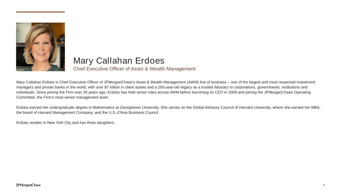 Mary Callahan Erdoes Chief Executive Officer of Asset & Wealth Management 4 Mary Callahan Erdoes is Chief Executive Officer of JPMorganChase's Asset & Wealth Management (AWM) line of business – one of the largest and most respected investment managers and private banks in the world, with over $7 trillion in client assets and a 200-year-old legacy as a trusted fiduciary to corporations, governments, institutions and individuals. Since joining the Firm over 25 years ago, Erdoes has held senior roles across AWM before becoming its CEO in 2009 and joining the JPMorganChase Operating Committee, the Firm's most senior management team. Erdoes earned her undergraduate degree in Mathematics at Georgetown University. She serves on the Global Advisory Council of Harvard University, where she earned her MBA, the board of Harvard Management Company, and the U.S.-China Business Council. Erdoes resides in New York City and has three daughters.