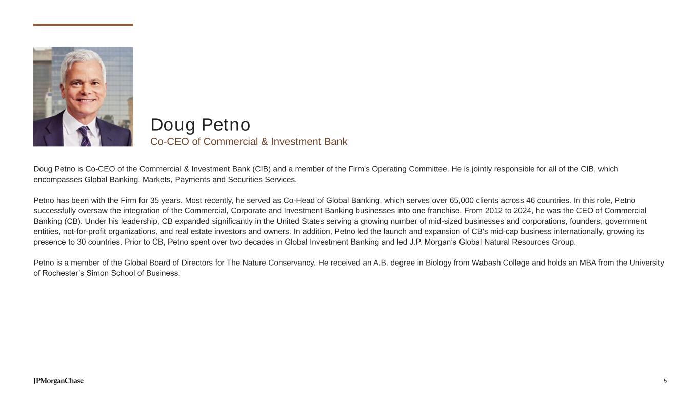 Doug Petno Co-CEO of Commercial & Investment Bank 5 Doug Petno is Co-CEO of the Commercial & Investment Bank (CIB) and a member of the Firm's Operating Committee. He is jointly responsible for all of the CIB, which encompasses Global Banking, Markets, Payments and Securities Services. Petno has been with the Firm for 35 years. Most recently, he served as Co-Head of Global Banking, which serves over 65,000 clients across 46 countries. In this role, Petno successfully oversaw the integration of the Commercial, Corporate and Investment Banking businesses into one franchise. From 2012 to 2024, he was the CEO of Commercial Banking (CB). Under his leadership, CB expanded significantly in the United States serving a growing number of mid-sized businesses and corporations, founders, government entities, not-for-profit organizations, and real estate investors and owners. In addition, Petno led the launch and expansion of CB's mid-cap business internationally, growing its presence to 30 countries. Prior to CB, Petno spent over two decades in Global Investment Banking and led J.P. Morgan’s Global Natural Resources Group. Petno is a member of the Global Board of Directors for The Nature Conservancy. He received an A.B. degree in Biology from Wabash College and holds an MBA from the University of Rochester’s Simon School of Business.