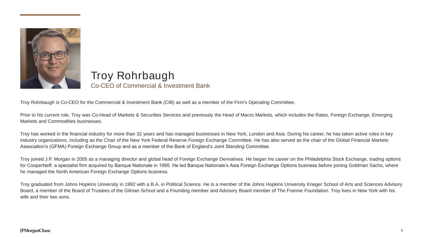 Troy Rohrbaugh Co-CEO of Commercial & Investment Bank Troy Rohrbaugh is Co-CEO for the Commercial & Investment Bank (CIB) as well as a member of the Firm's Operating Committee. Prior to his current role, Troy was Co-Head of Markets & Securities Services and previously the Head of Macro Markets, which includes the Rates, Foreign Exchange, Emerging Markets and Commodities businesses. Troy has worked in the financial industry for more than 32 years and has managed businesses in New York, London and Asia. During his career, he has taken active roles in key industry organizations, including as the Chair of the New York Federal Reserve Foreign Exchange Committee. He has also served as the chair of the Global Financial Markets Association’s (GFMA) Foreign Exchange Group and as a member of the Bank of England’s Joint Standing Committee. Troy joined J.P. Morgan in 2005 as a managing director and global head of Foreign Exchange Derivatives. He began his career on the Philadelphia Stock Exchange, trading options for CooperNeff, a specialist firm acquired by Banque Nationale in 1995. He led Banque Nationale’s Asia Foreign Exchange Options business before joining Goldman Sachs, where he managed the North American Foreign Exchange Options business. Troy graduated from Johns Hopkins University in 1992 with a B.A. in Political Science. He is a member of the Johns Hopkins University Krieger School of Arts and Sciences Advisory Board, a member of the Board of Trustees of the Gilman School and a Founding member and Advisory Board member of The Frannie Foundation. Troy lives in New York with his wife and their two sons. 6