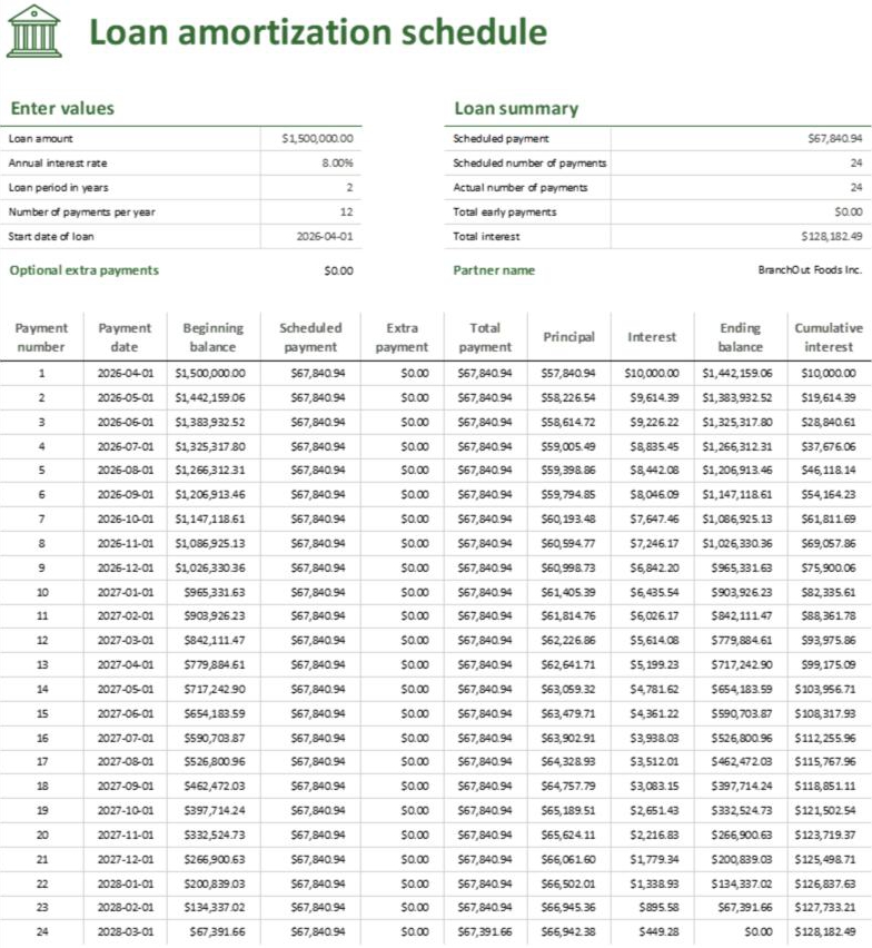The Borrower will pay the outstanding amount One Million Five Hundred Thousand Dollars ($1,500,000.00) together with the interest thereon at the rate of 8% per annum from the date hereof, calculated and compounded annually in arrears and not in advance, and interest on overdue interest at such rate, until payment in full, in incremental amounts of number of twenty-four (24) equal monthly installments of $67,840.94 (excluding applicable taxes) until the principal is paid off with the first installment payable on April 1st, 2026 and each subsequent installment payable on the first day of each and every month starting thereafter, along with interest accrued at the date of each such payment, and such amounts shall, upon payment thereof, be applied to reduce the aggregate principal amount of the Promissory Note along with the interest accrued at the date of such payments, The Borrower may pay in full an unpaid portion of the Promissory Note at any time without penalty.