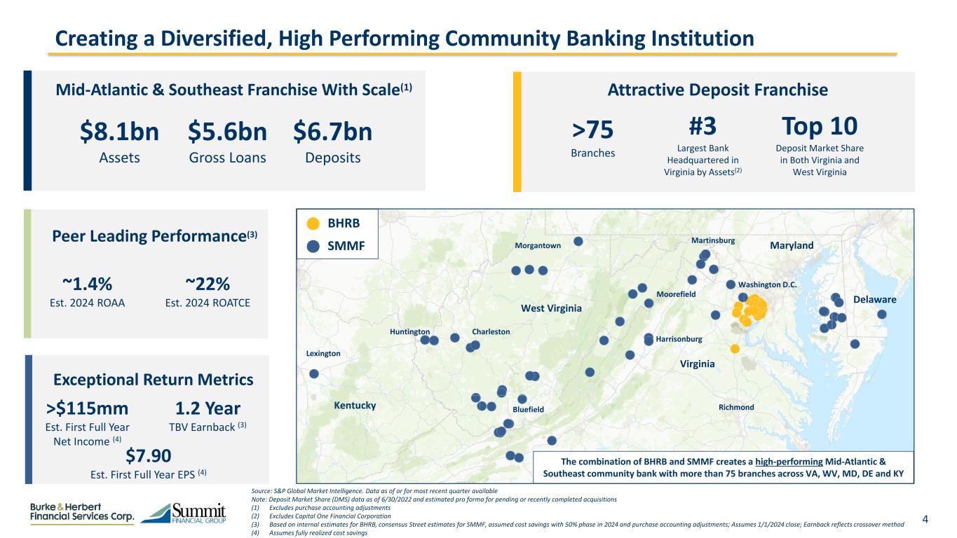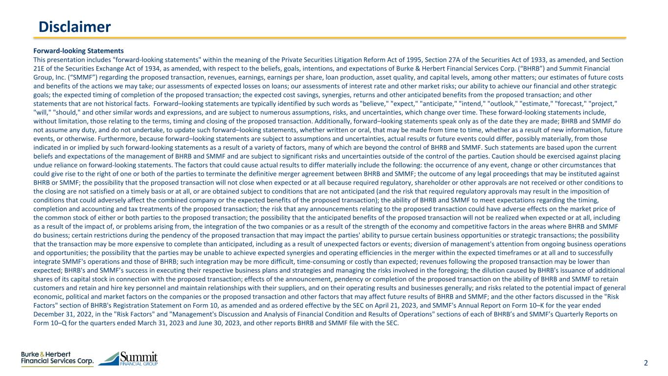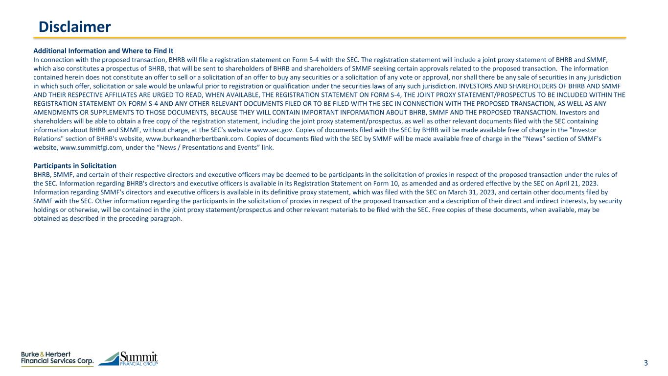 2 Forward-looking Statements This presentation includes "forward-looking statements" within the meaning of the Private Securities Litigation Reform Act of 1995, Section 27A of the Securities Act of 1933, as amended, and Section 21E of the Securities Exchange Act of 1934, as amended, with respect to the beliefs, goals, intentions, and expectations of Burke & Herbert Financial Services Corp. (“BHRB”) and Summit Financial Group, Inc. (“SMMF”) regarding the proposed transaction, revenues, earnings, earnings per share, loan production, asset quality, and capital levels, among other matters; our estimates of future costs and benefits of the actions we may take; our assessments of expected losses on loans; our assessments of interest rate and other market risks; our ability to achieve our financial and other strategic goals; the expected timing of completion of the proposed transaction; the expected cost savings, synergies, returns and other anticipated benefits from the proposed transaction; and other statements that are not historical facts. Forward–looking statements are typically identified by such words as "believe," "expect," "anticipate," "intend," "outlook," "estimate," "forecast," "project," "will," "should," and other similar words and expressions, and are subject to numerous assumptions, risks, and uncertainties, which change over time. These forward-looking statements include, without limitation, those relating to the terms, timing and closing of the proposed transaction. Additionally, forward–looking statements speak only as of the date they are made; BHRB and SMMF do not assume any duty, and do not undertake, to update such forward–looking statements, whether written or oral, that may be made from time to time, whether as a result of new information, future events, or otherwise. Furthermore, because forward–looking statements are subject to assumptions and uncertainties, actual results or future events could differ, possibly materially, from those indicated in or implied by such forward-looking statements as a result of a variety of factors, many of which are beyond the control of BHRB and SMMF. Such statements are based upon the current beliefs and expectations of the management of BHRB and SMMF and are subject to significant risks and uncertainties outside of the control of the parties. Caution should be exercised against placing undue reliance on forward-looking statements. The factors that could cause actual results to differ materially include the following: the occurrence of any event, change or other circumstances that could give rise to the right of one or both of the parties to terminate the definitive merger agreement between BHRB and SMMF; the outcome of any legal proceedings that may be instituted against BHRB or SMMF; the possibility that the proposed transaction will not close when expected or at all because required regulatory, shareholder or other approvals are not received or other conditions to the closing are not satisfied on a timely basis or at all, or are obtained subject to conditions that are not anticipated (and the risk that required regulatory approvals may result in the imposition of conditions that could adversely affect the combined company or the expected benefits of the proposed transaction); the ability of BHRB and SMMF to meet expectations regarding the timing, completion and accounting and tax treatments of the proposed transaction; the risk that any announcements relating to the proposed transaction could have adverse effects on the market price of the common stock of either or both parties to the proposed transaction; the possibility that the anticipated benefits of the proposed transaction will not be realized when expected or at all, including as a result of the impact of, or problems arising from, the integration of the two companies or as a result of the strength of the economy and competitive factors in the areas where BHRB and SMMF do business; certain restrictions during the pendency of the proposed transaction that may impact the parties' ability to pursue certain business opportunities or strategic transactions; the possibility that the transaction may be more expensive to complete than anticipated, including as a result of unexpected factors or events; diversion of management's attention from ongoing business operations and opportunities; the possibility that the parties may be unable to achieve expected synergies and operating efficiencies in the merger within the expected timeframes or at all and to successfully integrate SMMF's operations and those of BHRB; such integration may be more difficult, time-consuming or costly than expected; revenues following the proposed transaction may be lower than expected; BHRB's and SMMF’s success in executing their respective business plans and strategies and managing the risks involved in the foregoing; the dilution caused by BHRB's issuance of additional shares of its capital stock in connection with the proposed transaction; effects of the announcement, pendency or completion of the proposed transaction on the ability of BHRB and SMMF to retain customers and retain and hire key personnel and maintain relationships with their suppliers, and on their operating results and businesses generally; and risks related to the potential impact of general economic, political and market factors on the companies or the proposed transaction and other factors that may affect future results of BHRB and SMMF; and the other factors discussed in the "Risk Factors" section of BHRB's Registration Statement on Form 10, as amended and as ordered effective by the SEC on April 21, 2023, and SMMF's Annual Report on Form 10–K for the year ended December 31, 2022, in the "Risk Factors" and "Management's Discussion and Analysis of Financial Condition and Results of Operations" sections of each of BHRB’s and SMMF’s Quarterly Reports on Form 10–Q for the quarters ended March 31, 2023 and June 30, 20