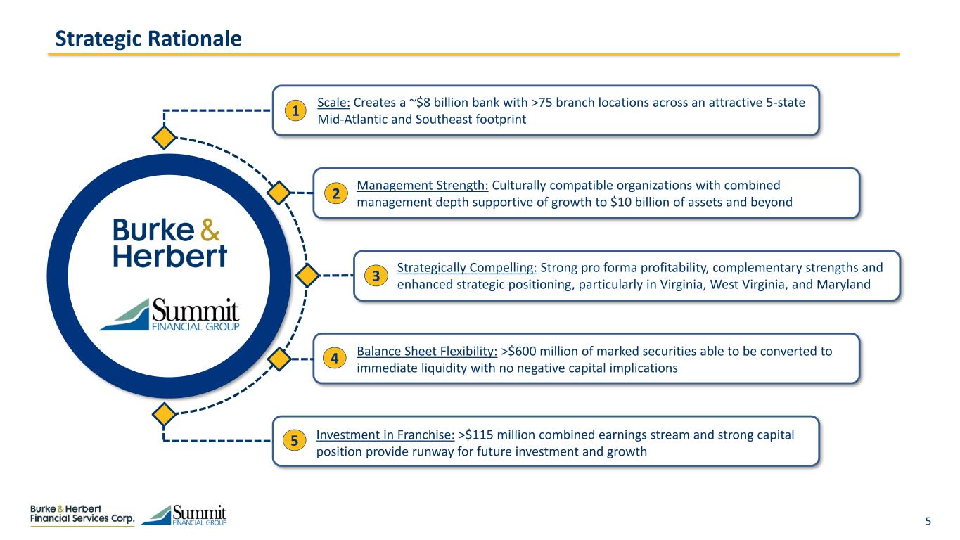 4 Creating a Diversified, High Performing Community Banking Institution BHRB SMMF The combination of BHRB and SMMF creates a high-performing Mid-Atlantic & Southeast community bank with more than 75 branches across VA, WV, MD, DE and KY $8.1bn Assets $5.6bn Gross Loans $6.7bn Deposits Mid-Atlantic & Southeast Franchise With Scale(1) Exceptional Return Metrics >$115mm Est. First Full Year Net Income (4) 1.2 Year TBV Earnback (3) Attractive Deposit Franchise >75 Branches #3 Largest Bank Headquartered in Virginia by Assets(2) Top 10 Deposit Market Share in Both Virginia and West Virginia Peer Leading Performance(3) ~1.4% Est. 2024 ROAA ~22% Est. 2024 ROATCE Source: S&P Global Market Intelligence. Data as of or for most recent quarter available Note: Deposit Market Share (DMS) data as of 6/30/2022 and estimated pro forma for pending or recently completed acquisitions (1) Excludes purchase accounting adjustments (2) Excludes Capital One Financial Corporation (3) Based on internal estimates for BHRB, consensus Street estimates for SMMF, assumed cost savings with 50% phase in 2024 and purchase accounting adjustments; Assumes 1/1/2024 close; Earnback reflects crossover method (4) Assumes fully realized cost savings West Virginia Washington D.C. Delaware Morgantown Bluefield Virginia Lexington Charleston Martinsburg Maryland Kentucky $7.90 Est. First Full Year EPS (4) Richmond Moorefield Huntington Harrisonburg