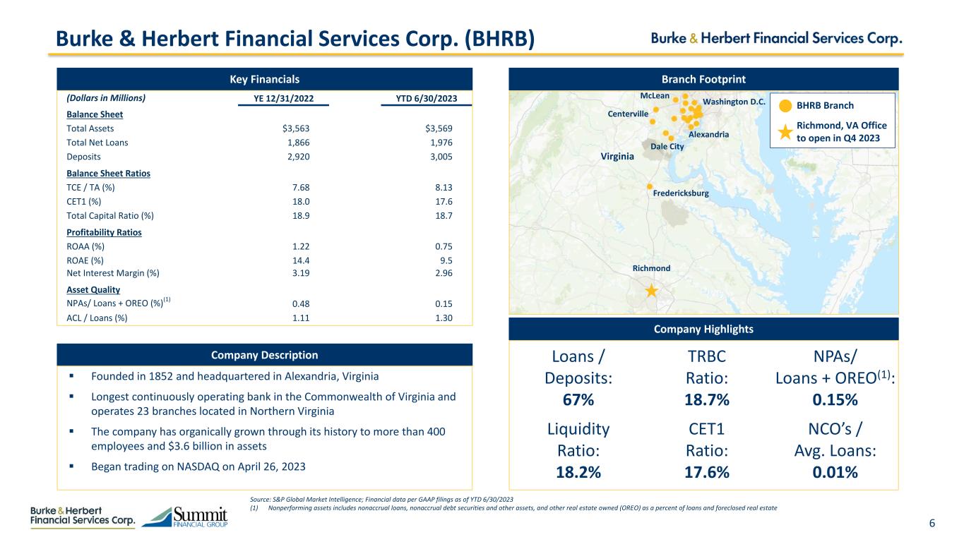 5 1 2 3 4 5 Strategically Compelling: Strong pro forma profitability, complementary strengths and enhanced strategic positioning, particularly in Virginia, West Virginia, and Maryland Scale: Creates a ~$8 billion bank with >75 branch locations across an attractive 5-state Mid-Atlantic and Southeast footprint Management Strength: Culturally compatible organizations with combined management depth supportive of growth to $10 billion of assets and beyond Investment in Franchise: >$115 million combined earnings stream and strong capital position provide runway for future investment and growth Balance Sheet Flexibility: >$600 million of marked securities able to be converted to immediate liquidity with no negative capital implications Strategic Rationale