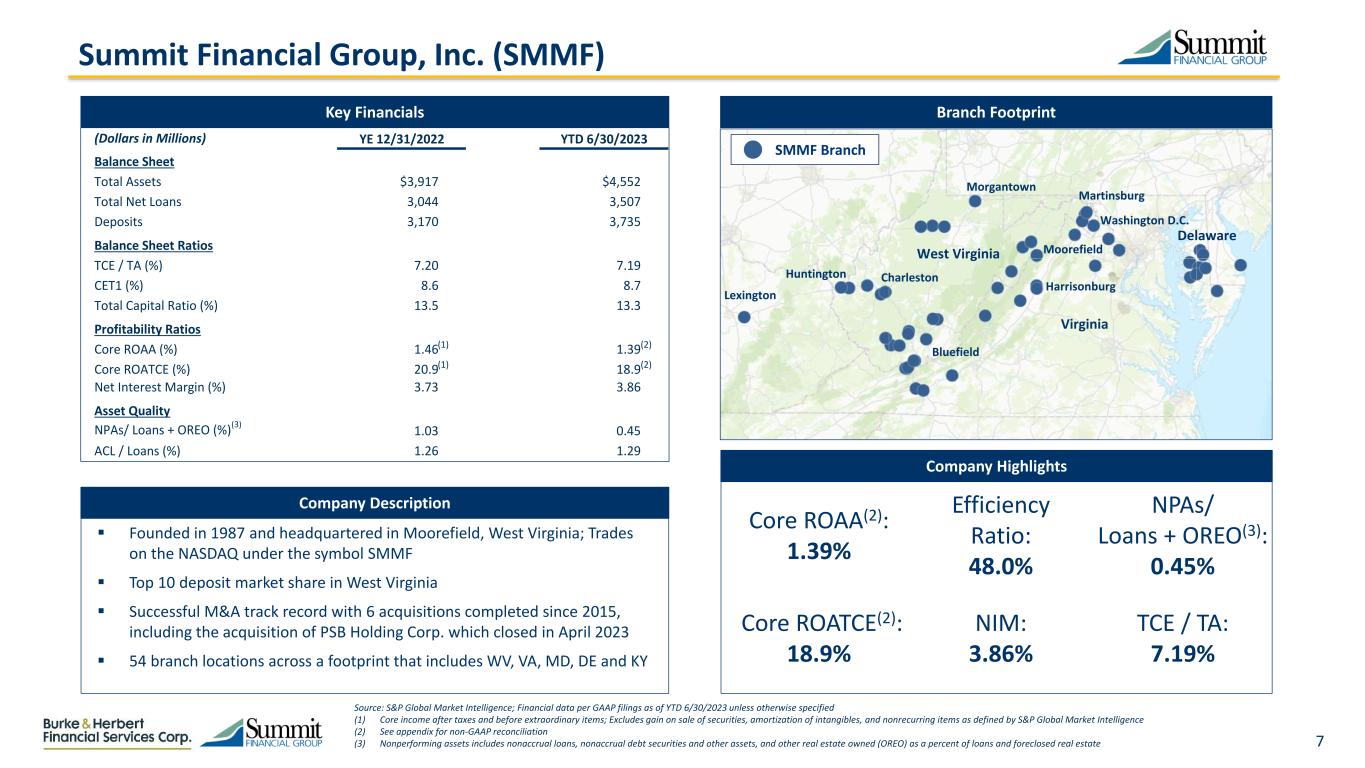 6 Source: S&P Global Market Intelligence; Financial data per GAAP filings as of YTD 6/30/2023 (1) Nonperforming assets includes nonaccrual loans, nonaccrual debt securities and other assets, and other real estate owned (OREO) as a percent of loans and foreclosed real estate Burke & Herbert Financial Services Corp. (BHRB) Key Financials Branch Footprint Company Highlights CET1 Ratio: 17.6% TRBC Ratio: 18.7% NCO’s / Avg. Loans: 0.01% Loans / Deposits: 67% NPAs/ Loans + OREO(1): 0.15% Liquidity Ratio: 18.2% Company Description  Founded in 1852 and headquartered in Alexandria, Virginia  Longest continuously operating bank in the Commonwealth of Virginia and operates 23 branches located in Northern Virginia  The company has organically grown through its history to more than 400 employees and $3.6 billion in assets  Began trading on NASDAQ on April 26, 2023 Washington D.C. Dale City McLean Centerville Alexandria Virginia Fredericksburg (Dollars in Millions) YE 12/31/2022 YTD 6/30/2023 Balance Sheet Total Assets $3,563 $3,569 Total Net Loans 1,866 1,976 Deposits 2,920 3,005 Balance Sheet Ratios TCE / TA (%) 7.68 8.13 CET1 (%) 18.0 17.6 Total Capital Ratio (%) 18.9 18.7 Profitability Ratios ROAA (%) 1.22 0.75 ROAE (%) 14.4 9.5 Net Interest Margin (%) 3.19 2.96 Asset Quality NPAs/ Loans + OREO (%) (1) 0.48 0.15 ACL / Loans (%) 1.11 1.30 BHRB Branch Richmond, VA Office to open in Q4 2023 Richmond