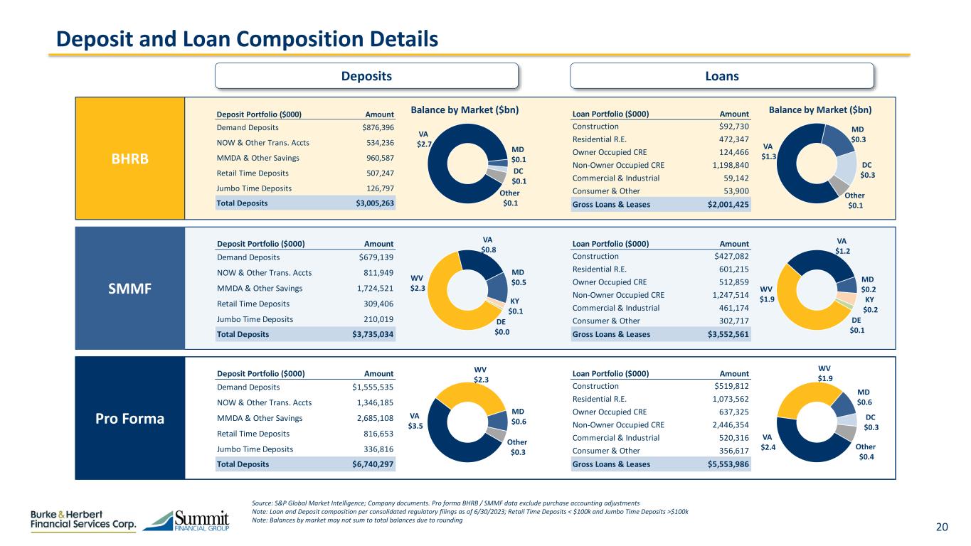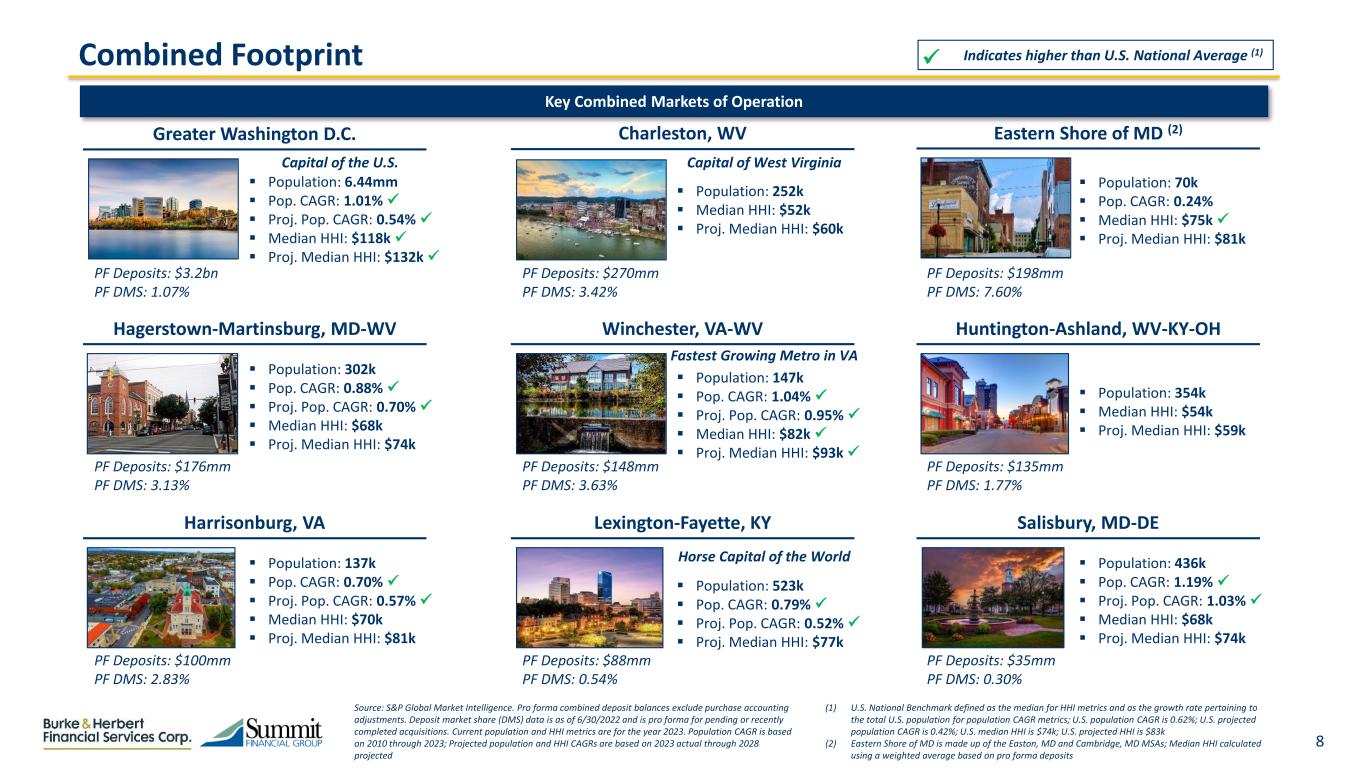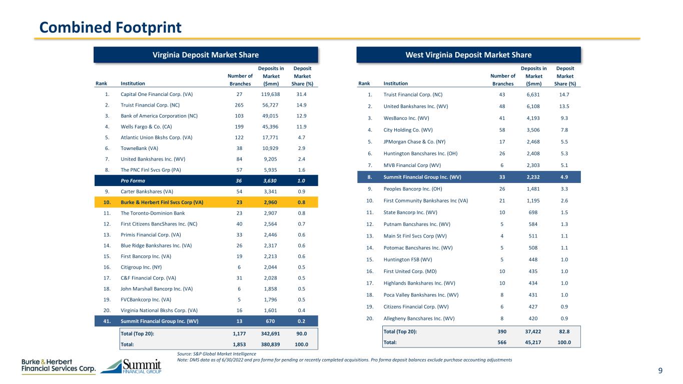 8  Population: 137k  Pop. CAGR: 0.70%   Proj. Pop. CAGR: 0.57%   Median HHI: $70k  Proj. Median HHI: $81k PF Deposits: $100mm PF DMS: 2.83% Harrisonburg, VA Combined Footprint Key Combined Markets of Operation Eastern Shore of MD (2)  Population: 70k  Pop. CAGR: 0.24%  Median HHI: $75k   Proj. Median HHI: $81k PF Deposits: $198mm PF DMS: 7.60% Charleston, WV  Population: 252k  Median HHI: $52k  Proj. Median HHI: $60k PF Deposits: $270mm PF DMS: 3.42% Source: S&P Global Market Intelligence. Pro forma combined deposit balances exclude purchase accounting adjustments. Deposit market share (DMS) data is as of 6/30/2022 and is pro forma for pending or recently completed acquisitions. Current population and HHI metrics are for the year 2023. Population CAGR is based on 2010 through 2023; Projected population and HHI CAGRs are based on 2023 actual through 2028 projected (1) U.S. National Benchmark defined as the median for HHI metrics and as the growth rate pertaining to the total U.S. population for population CAGR metrics; U.S. population CAGR is 0.62%; U.S. projected population CAGR is 0.42%; U.S. median HHI is $74k; U.S. projected HHI is $83k (2) Eastern Shore of MD is made up of the Easton, MD and Cambridge, MD MSAs; Median HHI calculated using a weighted average based on pro forma deposits Hagerstown-Martinsburg, MD-WV  Population: 302k  Pop. CAGR: 0.88%   Proj. Pop. CAGR: 0.70%   Median HHI: $68k  Proj. Median HHI: $74k PF Deposits: $176mm PF DMS: 3.13% PF Deposits: $3.2bn PF DMS: 1.07%  Population: 6.44mm  Pop. CAGR: 1.01%   Proj. Pop. CAGR: 0.54%   Median HHI: $118k   Proj. Median HHI: $132k  Greater Washington D.C. Indicates higher than U.S. National Average (1)  Lexington-Fayette, KY  Population: 523k  Pop. CAGR: 0.79%   Proj. Pop. CAGR: 0.52%   Proj. Median HHI: $77k PF Deposits: $88mm PF DMS: 0.54%  Population: 147k  Pop. CAGR: 1.04%   Proj. Pop. CAGR: 0.95%   Median HHI: $82k   Proj. Median HHI: $93k  Winchester, VA-WV PF Deposits: $148mm PF DMS: 3.63% Huntington-Ashland, WV-KY-OH  Population: 354k  Median HHI: $54k  Proj. Median HHI: $59k PF Deposits: $135mm PF DMS: 1.77% Salisbury, MD-DE  Population: 436k  Pop. CAGR: 1.19%   Proj. Pop. CAGR: 1.03%   Median HHI: $68k  Proj. Median HHI: $74k PF Deposits: $35mm PF DMS: 0.30% Fastest Growing Metro in VA Horse Capital of the World Capital of the U.S. Capital of West Virginia