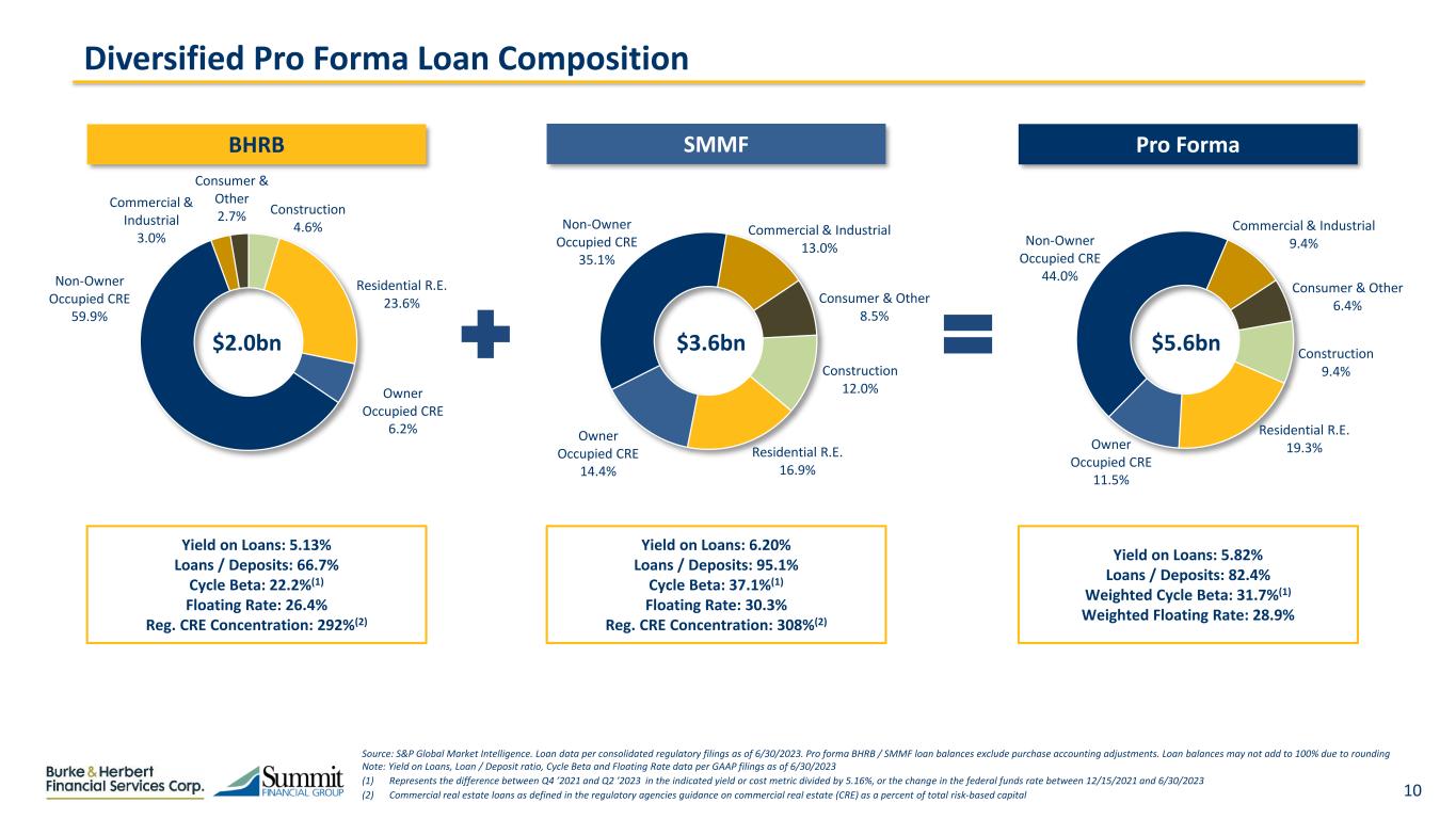 9 Combined Footprint Virginia Deposit Market Share West Virginia Deposit Market Share Source: S&P Global Market Intelligence Note: DMS data as of 6/30/2022 and pro forma for pending or recently completed acquisitions. Pro forma deposit balances exclude purchase accounting adjustments Rank Institution Number of Branches Deposits in Market ($mm) Deposit Market Share (%) 1. Capital One Financial Corp. (VA) 27 119,638 31.4 2. Truist Financial Corp. (NC) 265 56,727 14.9 3. Bank of America Corporation (NC) 103 49,015 12.9 4. Wells Fargo & Co. (CA) 199 45,396 11.9 5. Atlantic Union Bkshs Corp. (VA) 122 17,771 4.7 6. TowneBank (VA) 38 10,929 2.9 7. United Bankshares Inc. (WV) 84 9,205 2.4 8. The PNC Finl Svcs Grp (PA) 57 5,935 1.6 Pro Forma 36 3,630 1.0 9. Carter Bankshares (VA) 54 3,341 0.9 10. Burke & Herbert Finl Svcs Corp (VA) 23 2,960 0.8 11. The Toronto-Dominion Bank 23 2,907 0.8 12. First Citizens BancShares Inc. (NC) 40 2,564 0.7 13. Primis Financial Corp. (VA) 33 2,446 0.6 14. Blue Ridge Bankshares Inc. (VA) 26 2,317 0.6 15. First Bancorp Inc. (VA) 19 2,213 0.6 16. Citigroup Inc. (NY) 6 2,044 0.5 17. C&F Financial Corp. (VA) 31 2,028 0.5 18. John Marshall Bancorp Inc. (VA) 6 1,858 0.5 19. FVCBankcorp Inc. (VA) 5 1,796 0.5 20. Virginia National Bkshs Corp. (VA) 16 1,601 0.4 41. Summit Financial Group Inc. (WV) 13 670 0.2 Total (Top 20): 1,177 342,691 90.0 Total: 1,853 380,839 100.0 Rank Institution Number of Branches Deposits in Market ($mm) Deposit Market Share (%) 1. Truist Financial Corp. (NC) 43 6,631 14.7 2. United Bankshares Inc. (WV) 48 6,108 13.5 3. WesBanco Inc. (WV) 41 4,193 9.3 4. City Holding Co. (WV) 58 3,506 7.8 5. JPMorgan Chase & Co. (NY) 17 2,468 5.5 6. Huntington Bancshares Inc. (OH) 26 2,408 5.3 7. MVB Financial Corp (WV) 6 2,303 5.1 8. Summit Financial Group Inc. (WV) 33 2,232 4.9 9. Peoples Bancorp Inc. (OH) 26 1,481 3.3 10. First Community Bankshares Inc (VA) 21 1,195 2.6 11. State Bancorp Inc. (WV) 10 698 1.5 12. Putnam Bancshares Inc. (WV) 5 584 1.3 13. Main St Finl Svcs Corp (WV) 4 511 1.1 14. Potomac Bancshares Inc. (WV) 5 508 1.1 15. Huntington FSB (WV) 5 448 1.0 16. First United Corp. (MD) 10 435 1.0 17. Highlands Bankshares Inc. (WV) 10 434 1.0 18. Poca Valley Bankshares Inc. (WV) 8 431 1.0 19. Citizens Financial Corp. (WV) 6 427 0.9 20. Allegheny Bancshares Inc. (WV) 8 420 0.9 Total (Top 20): 390 37,422 82.8 Total: 566 45,217 100.0