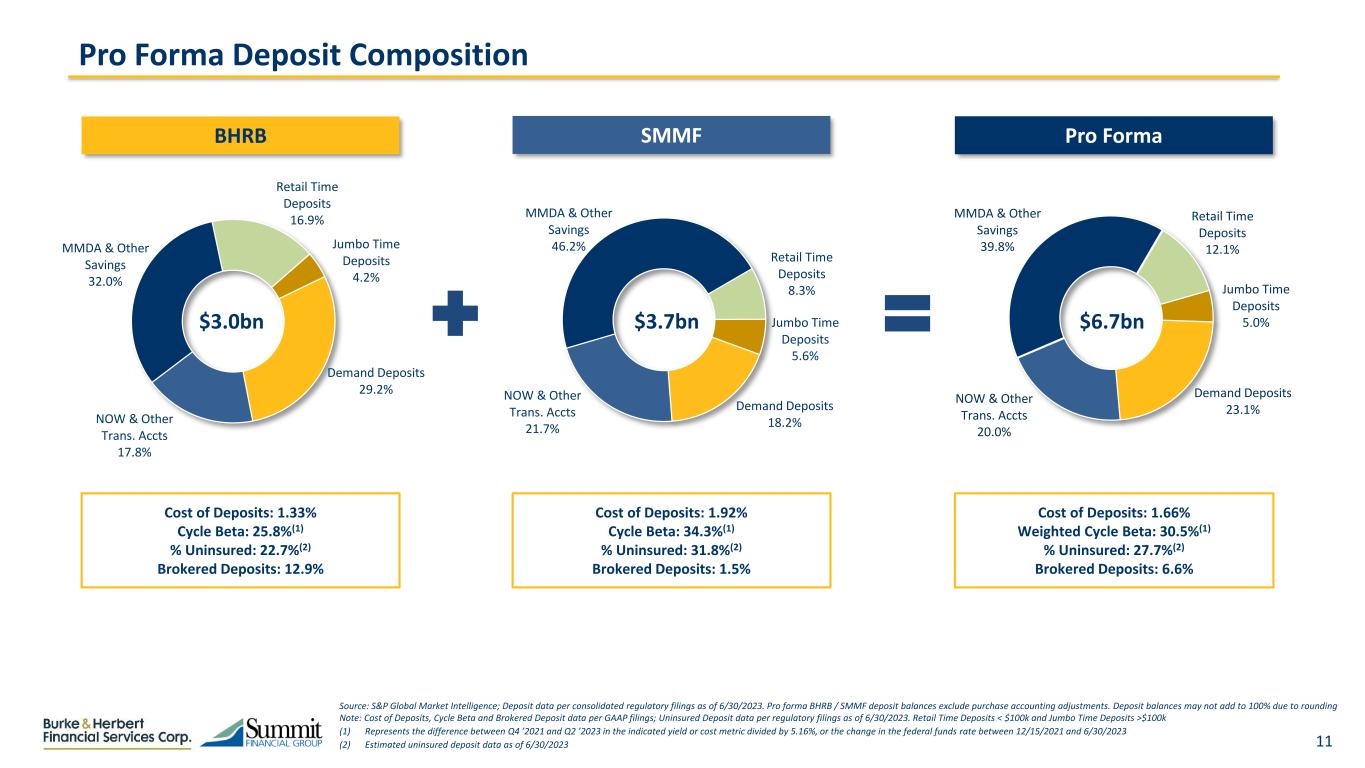 10 Construction 4.6% Residential R.E. 23.6% Owner Occupied CRE 6.2% Non-Owner Occupied CRE 59.9% Commercial & Industrial 3.0% Consumer & Other 2.7% Source: S&P Global Market Intelligence. Loan data per consolidated regulatory filings as of 6/30/2023. Pro forma BHRB / SMMF loan balances exclude purchase accounting adjustments. Loan balances may not add to 100% due to rounding Note: Yield on Loans, Loan / Deposit ratio, Cycle Beta and Floating Rate data per GAAP filings as of 6/30/2023 (1) Represents the difference between Q4 ’2021 and Q2 ’2023 in the indicated yield or cost metric divided by 5.16%, or the change in the federal funds rate between 12/15/2021 and 6/30/2023 (2) Commercial real estate loans as defined in the regulatory agencies guidance on commercial real estate (CRE) as a percent of total risk-based capital Construction 9.4% Residential R.E. 19.3% Owner Occupied CRE 11.5% Non-Owner Occupied CRE 44.0% Commercial & Industrial 9.4% Consumer & Other 6.4% Construction 12.0% Residential R.E. 16.9% Owner Occupied CRE 14.4% Non-Owner Occupied CRE 35.1% Commercial & Industrial 13.0% Consumer & Other 8.5% Diversified Pro Forma Loan Composition Yield on Loans: 5.13% Loans / Deposits: 66.7% Cycle Beta: 22.2%(1) Floating Rate: 26.4% Reg. CRE Concentration: 292%(2) Yield on Loans: 6.20% Loans / Deposits: 95.1% Cycle Beta: 37.1%(1) Floating Rate: 30.3% Reg. CRE Concentration: 308%(2) Yield on Loans: 5.82% Loans / Deposits: 82.4% Weighted Cycle Beta: 31.7%(1) Weighted Floating Rate: 28.9% $2.0bn $3.6bn $5.6bn BHRB SMMF Pro Forma