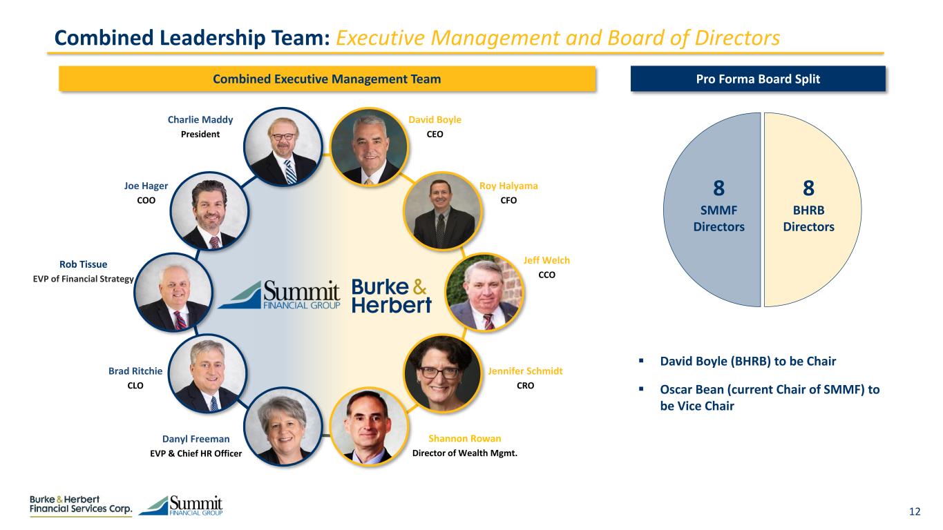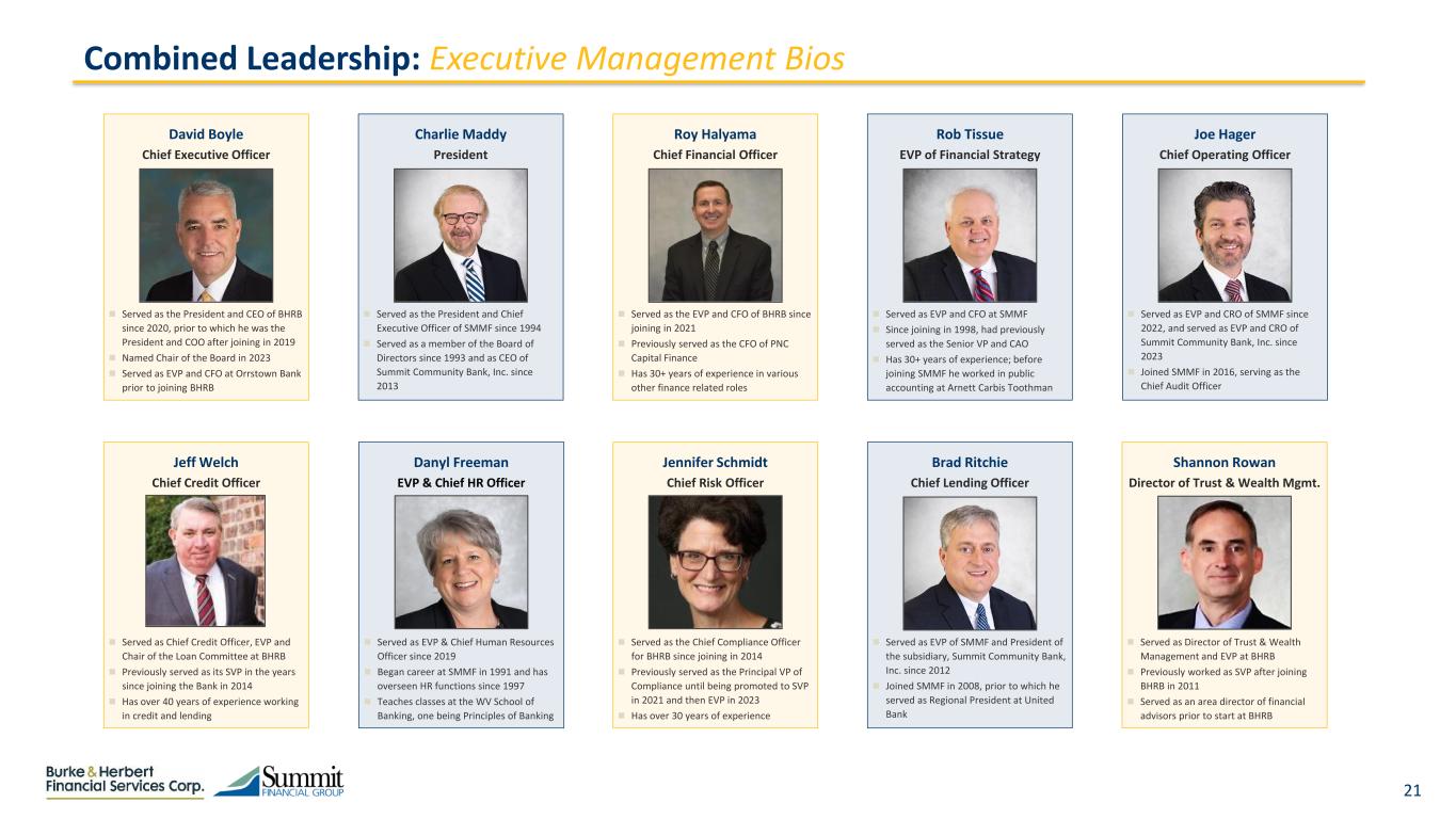 21  Served as the President and CEO of BHRB since 2020, prior to which he was the President and COO after joining in 2019  Named Chair of the Board in 2023  Served as EVP and CFO at Orrstown Bank prior to joining BHRB David Boyle Chief Executive Officer  Served as Chief Credit Officer, EVP and Chair of the Loan Committee at BHRB  Previously served as its SVP in the years since joining the Bank in 2014  Has over 40 years of experience working in credit and lending Jeff Welch Chief Credit Officer Combined Leadership: Executive Management Bios  Served as the President and Chief Executive Officer of SMMF since 1994  Served as a member of the Board of Directors since 1993 and as CEO of Summit Community Bank, Inc. since 2013 Charlie Maddy President  Served as EVP and CFO at SMMF  Since joining in 1998, had previously served as the Senior VP and CAO  Has 30+ years of experience; before joining SMMF he worked in public accounting at Arnett Carbis Toothman Rob Tissue EVP of Financial Strategy  Served as EVP of SMMF and President of the subsidiary, Summit Community Bank, Inc. since 2012  Joined SMMF in 2008, prior to which he served as Regional President at United Bank Brad Ritchie Chief Lending Officer  Served as EVP and CRO of SMMF since 2022, and served as EVP and CRO of Summit Community Bank, Inc. since 2023  Joined SMMF in 2016, serving as the Chief Audit Officer Joe Hager Chief Operating Officer  Served as the EVP and CFO of BHRB since joining in 2021  Previously served as the CFO of PNC Capital Finance  Has 30+ years of experience in various other finance related roles Roy Halyama Chief Financial Officer  Served as the Chief Compliance Officer for BHRB since joining in 2014  Previously served as the Principal VP of Compliance until being promoted to SVP in 2021 and then EVP in 2023  Has over 30 years of experience Jennifer Schmidt Chief Risk Officer  Served as Director of Trust & Wealth Management and EVP at BHRB  Previously worked as SVP after joining BHRB in 2011  Served as an area director of financial advisors prior to start at BHRB Shannon Rowan Director of Trust & Wealth Mgmt.  Served as EVP & Chief Human Resources Officer since 2019  Began career at SMMF in 1991 and has overseen HR functions since 1997  Teaches classes at the WV School of Banking, one being Principles of Banking Danyl Freeman EVP & Chief HR Officer