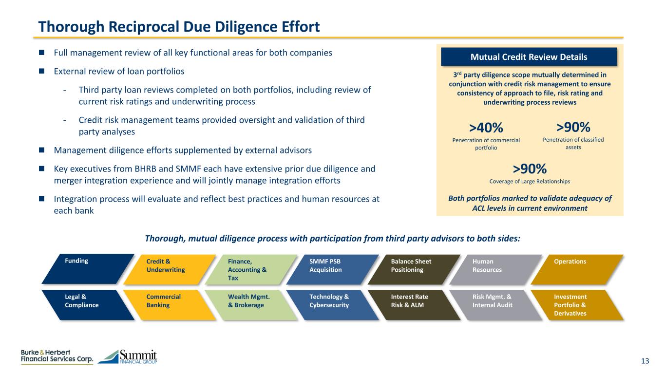 12 Joe Hager COO Combined Leadership Team: Executive Management and Board of Directors Charlie Maddy President Brad Ritchie CLO Rob Tissue EVP of Financial Strategy David Boyle CEO Roy Halyama CFO Jennifer Schmidt CRO Jeff Welch CCO Shannon Rowan Director of Wealth Mgmt. Pro Forma Board Split 8 SMMF Directors 8 BHRB Directors  David Boyle (BHRB) to be Chair  Oscar Bean (current Chair of SMMF) to be Vice Chair Danyl Freeman EVP & Chief HR Officer Combined Executive Management Team