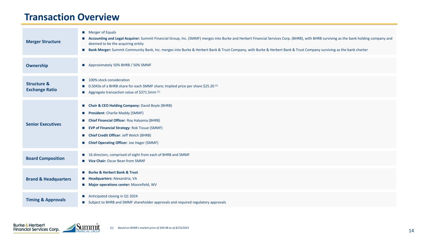 13  Full management review of all key functional areas for both companies  External review of loan portfolios ‐ Third party loan reviews completed on both portfolios, including review of current risk ratings and underwriting process ‐ Credit risk management teams provided oversight and validation of third party analyses  Management diligence efforts supplemented by external advisors  Key executives from BHRB and SMMF each have extensive prior due diligence and merger integration experience and will jointly manage integration efforts  Integration process will evaluate and reflect best practices and human resources at each bank Credit & Underwriting Funding Investment Portfolio & Derivatives Interest Rate Risk & ALM SMMF PSB Acquisition Risk Mgmt. & Internal Audit Human Resources Technology & Cybersecurity Balance Sheet Positioning Operations Legal & Compliance Commercial Banking Finance, Accounting & Tax Wealth Mgmt. & Brokerage Thorough Reciprocal Due Diligence Effort Thorough, mutual diligence process with participation from third party advisors to both sides: Mutual Credit Review Details >40% Penetration of commercial portfolio >90% Coverage of Large Relationships Both portfolios marked to validate adequacy of ACL levels in current environment >90% Penetration of classified assets 3rd party diligence scope mutually determined in conjunction with credit risk management to ensure consistency of approach to file, risk rating and underwriting process reviews