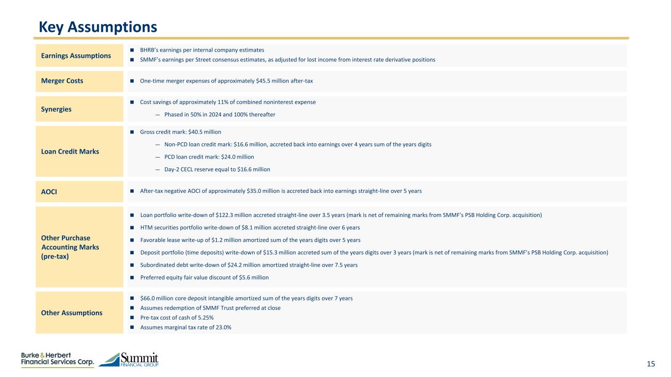 14 (1) Based on BHRB’s market price of $49.98 as of 8/23/2023 Transaction Overview Merger Structure  Merger of Equals  Accounting and Legal Acquirer: Summit Financial Group, Inc. (SMMF) merges into Burke and Herbert Financial Services Corp. (BHRB), with BHRB surviving as the bank holding company and deemed to be the acquiring entity  Bank Merger: Summit Community Bank, Inc. merges into Burke & Herbert Bank & Trust Company, with Burke & Herbert Bank & Trust Company surviving as the bank charter Ownership  Approximately 50% BHRB / 50% SMMF Structure & Exchange Ratio  100% stock consideration  0.5043x of a BHRB share for each SMMF share; Implied price per share $25.20 (1)  Aggregate transaction value of $371.5mm (1) Senior Executives  Chair & CEO Holding Company: David Boyle (BHRB)  President: Charlie Maddy (SMMF)  Chief Financial Officer: Roy Halyama (BHRB)  EVP of Financial Strategy: Rob Tissue (SMMF)  Chief Credit Officer: Jeff Welch (BHRB)  Chief Operating Officer: Joe Hager (SMMF) Board Composition  16 directors, comprised of eight from each of BHRB and SMMF  Vice Chair: Oscar Bean from SMMF Brand & Headquarters  Burke & Herbert Bank & Trust  Headquarters: Alexandria, VA  Major operations center: Moorefield, WV Timing & Approvals  Anticipated closing in Q1 2024  Subject to BHRB and SMMF shareholder approvals and required regulatory approvals