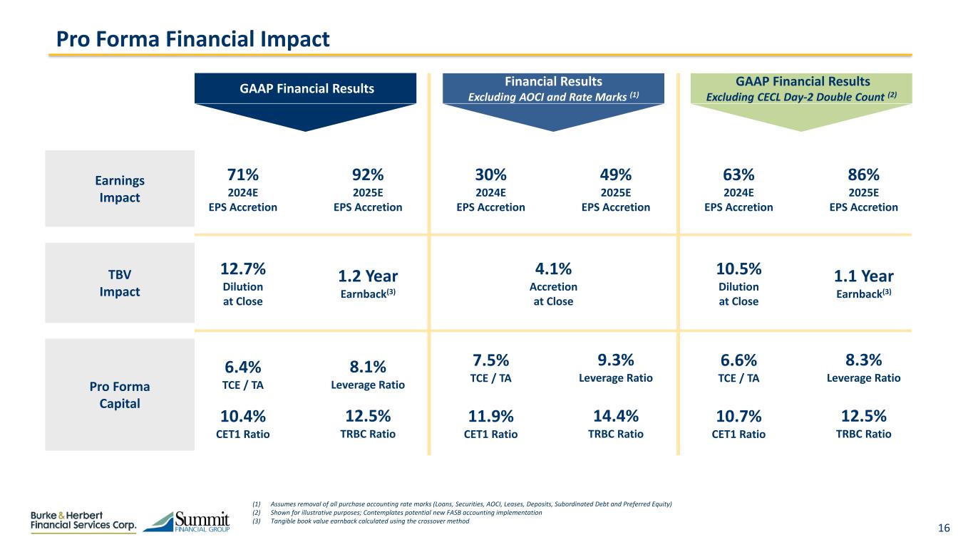15 Key Assumptions Earnings Assumptions  BHRB’s earnings per internal company estimates  SMMF’s earnings per Street consensus estimates, as adjusted for lost income from interest rate derivative positions Merger Costs  One-time merger expenses of approximately $45.5 million after-tax Synergies  Cost savings of approximately 11% of combined noninterest expense — Phased in 50% in 2024 and 100% thereafter Loan Credit Marks  Gross credit mark: $40.5 million — Non-PCD loan credit mark: $16.6 million, accreted back into earnings over 4 years sum of the years digits — PCD loan credit mark: $24.0 million — Day-2 CECL reserve equal to $16.6 million AOCI  After-tax negative AOCI of approximately $35.0 million is accreted back into earnings straight-line over 5 years Other Purchase Accounting Marks (pre-tax)  Loan portfolio write-down of $122.3 million accreted straight-line over 3.5 years (mark is net of remaining marks from SMMF’s PSB Holding Corp. acquisition)  HTM securities portfolio write-down of $8.1 million accreted straight-line over 6 years  Favorable lease write-up of $1.2 million amortized sum of the years digits over 5 years  Deposit portfolio (time deposits) write-down of $15.3 million accreted sum of the years digits over 3 years (mark is net of remaining marks from SMMF’s PSB Holding Corp. acquisition)  Subordinated debt write-down of $24.2 million amortized straight-line over 7.5 years  Preferred equity fair value discount of $5.6 million Other Assumptions  $66.0 million core deposit intangible amortized sum of the years digits over 7 years  Assumes redemption of SMMF Trust preferred at close  Pre-tax cost of cash of 5.25%  Assumes marginal tax rate of 23.0%