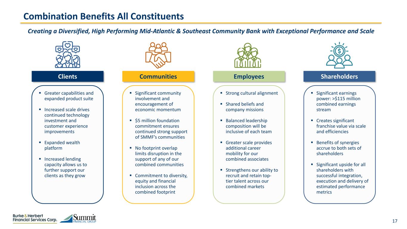 16 (1) Assumes removal of all purchase accounting rate marks (Loans, Securities, AOCI, Leases, Deposits, Subordinated Debt and Preferred Equity) (2) Shown for illustrative purposes; Contemplates potential new FASB accounting implementation (3) Tangible book value earnback calculated using the crossover method Pro Forma Financial Impact Earnings Impact TBV Impact Pro Forma Capital GAAP Financial Results Financial Results Excluding AOCI and Rate Marks (1) 71% 2024E EPS Accretion 92% 2025E EPS Accretion GAAP Financial Results Excluding CECL Day-2 Double Count (2) 12.7% Dilution at Close 1.2 Year Earnback(3) 6.4% TCE / TA 8.1% Leverage Ratio 10.4% CET1 Ratio 12.5% TRBC Ratio 30% 2024E EPS Accretion 49% 2025E EPS Accretion 4.1% Accretion at Close 7.5% TCE / TA 9.3% Leverage Ratio 11.9% CET1 Ratio 14.4% TRBC Ratio 63% 2024E EPS Accretion 86% 2025E EPS Accretion 10.5% Dilution at Close 1.1 Year Earnback(3) 6.6% TCE / TA 8.3% Leverage Ratio 10.7% CET1 Ratio 12.5% TRBC Ratio