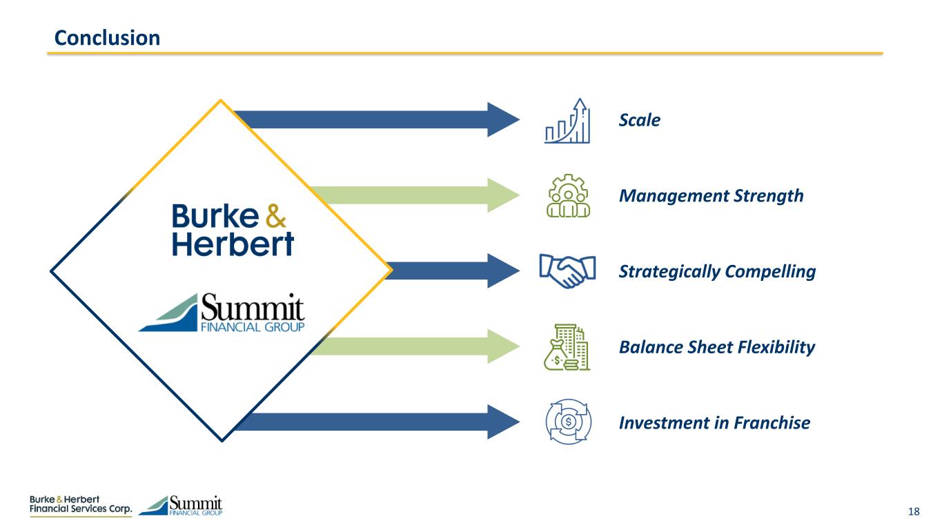 17 Combination Benefits All Constituents Creating a Diversified, High Performing Mid-Atlantic & Southeast Community Bank with Exceptional Performance and Scale Clients Communities Employees Shareholders  Greater capabilities and expanded product suite  Increased scale drives continued technology investment and customer experience improvements  Expanded wealth platform  Increased lending capacity allows us to further support our clients as they grow  Significant community involvement and encouragement of economic momentum  $5 million foundation commitment ensures continued strong support of SMMF’s communities  No footprint overlap limits disruption in the support of any of our combined communities  Commitment to diversity, equity and financial inclusion across the combined footprint  Strong cultural alignment  Shared beliefs and company missions  Balanced leadership composition will be inclusive of each team  Greater scale provides additional career mobility for our combined associates  Strengthens our ability to recruit and retain top- tier talent across our combined markets  Significant earnings power: >$115 million combined earnings stream  Creates significant franchise value via scale and efficiencies  Benefits of synergies accrue to both sets of shareholders  Significant upside for all shareholders with successful integration, execution and delivery of estimated performance metrics