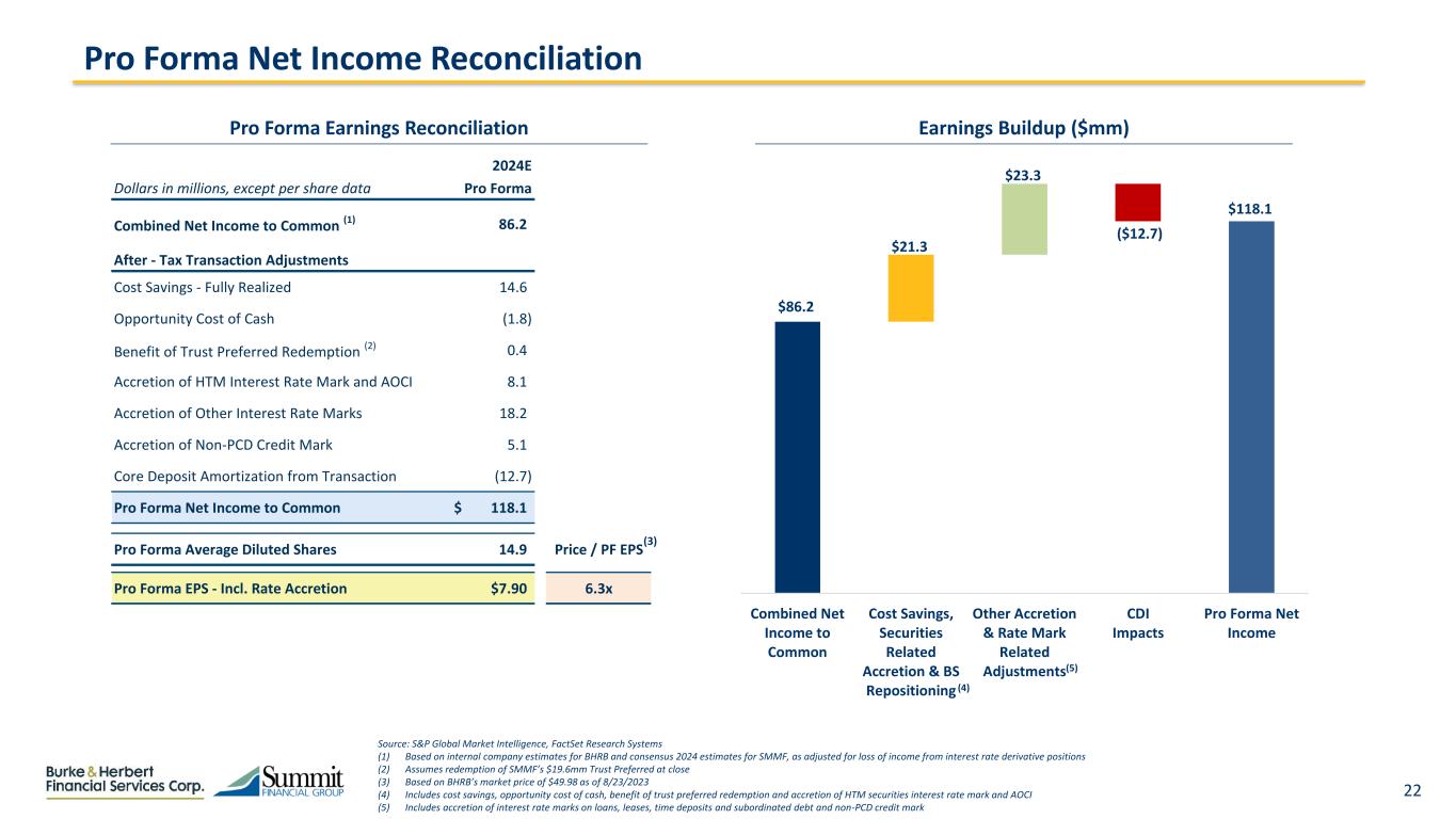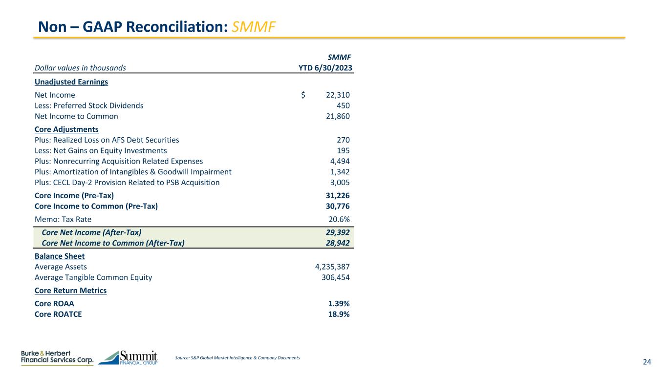 22 Pro Forma Net Income Reconciliation Pro Forma Earnings Reconciliation Earnings Buildup ($mm) 2024E Dollars in millions, except per share data Pro Forma Combined Net Income to Common (1) 86.2 After - Tax Transaction Adjustments Cost Savings - Fully Realized 14.6 Opportunity Cost of Cash (1.8) Benefit of Trust Preferred Redemption (2) 0.4 Accretion of HTM Interest Rate Mark and AOCI 8.1 Accretion of Other Interest Rate Marks 18.2 Accretion of Non-PCD Credit Mark 5.1 Core Deposit Amortization from Transaction (12.7) Pro Forma Net Income to Common 118.1$ Pro Forma Average Diluted Shares 14.9 Price / PF EPS Pro Forma EPS - Incl. Rate Accretion $7.90 6.3x (3) $86.2 $21.3 $23.3 ($12.7) $118.1 Combined Net Income to Common Cost Savings, Securities Related Accretion & BS Repositioning Other Accretion & Rate Mark Related Adjustments CDI Impacts Pro Forma Net Income (4) Source: S&P Global Market Intelligence, FactSet Research Systems (1) Based on internal company estimates for BHRB and consensus 2024 estimates for SMMF, as adjusted for loss of income from interest rate derivative positions (2) Assumes redemption of SMMF’s $19.6mm Trust Preferred at close (3) Based on BHRB’s market price of $49.98 as of 8/23/2023 (4) Includes cost savings, opportunity cost of cash, benefit of trust preferred redemption and accretion of HTM securities interest rate mark and AOCI (5) Includes accretion of interest rate marks on loans, leases, time deposits and subordinated debt and non-PCD credit mark (5)