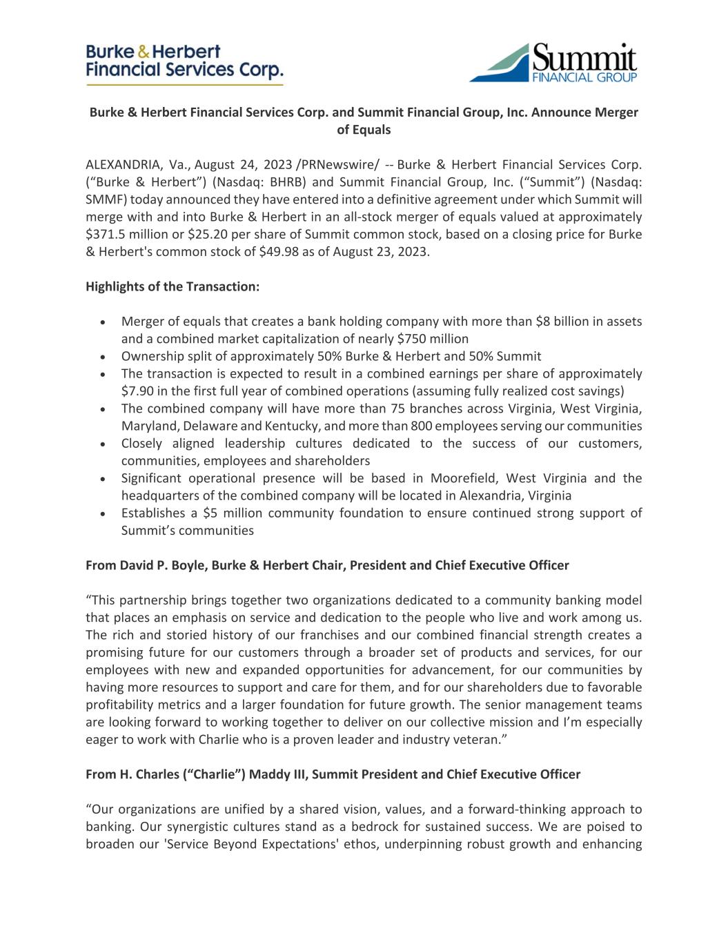 Burke & Herbert Financial Services Corp. and Summit Financial Group, Inc. Announce Merger  of Equals    ALEXANDRIA,  Va., August  24,  2023 /PRNewswire/  ‐‐ Burke &  Herbert  Financial  Services  Corp.  (“Burke  &  Herbert”)  (Nasdaq:  BHRB)  and  Summit  Financial  Group,  Inc.  (“Summit”)  (Nasdaq:  SMMF) today announced they have entered into a definitive agreement under which Summit will  merge with and into Burke & Herbert in an all‐stock merger of equals valued at approximately  $371.5 million or $25.20 per share of Summit common stock, based on a closing price for Burke  & Herbert's common stock of $49.98 as of August 23, 2023.     Highlights of the Transaction:     Merger of equals that creates a bank holding company with more than $8 billion in assets  and a combined market capitalization of nearly $750 million   Ownership split of approximately 50% Burke & Herbert and 50% Summit   The transaction is expected to result in a combined earnings per share of approximately  $7.90 in the first full year of combined operations (assuming fully realized cost savings)   The combined company will have more than 75 branches across Virginia, West Virginia,  Maryland, Delaware and Kentucky, and more than 800 employees serving our communities   Closely  aligned  leadership  cultures  dedicated  to  the  success  of  our  customers,  communities, employees and shareholders     Significant  operational  presence  will  be  based  in  Moorefield,  West  Virginia  and  the  headquarters of the combined company will be located in Alexandria, Virginia   Establishes  a  $5 million  community  foundation  to  ensure  continued  strong  support  of  Summit’s communities    From David P. Boyle, Burke & Herbert Chair, President and Chief Executive Officer    “This partnership brings together two organizations dedicated to a community banking model  that places an emphasis on service and dedication to the people who live and work among us.   The  rich  and  storied  history  of  our  franchises  and  our  combined  financial  strength  creates  a  promising  future  for  our  customers  through  a  broader  set  of  products  and  services,  for  our  employees with  new  and  expanded  opportunities  for  advancement,  for  our  communities  by  having more resources to support and care for them, and for our shareholders due to favorable  profitability metrics and a larger foundation for future growth. The senior management teams  are looking forward to working together to deliver on our collective mission and I’m especially  eager to work with Charlie who is a proven leader and industry veteran.”        From H. Charles (“Charlie”) Maddy III, Summit President and Chief Executive Officer    “Our organizations are unified by a shared vision, values, and a  forward‐thinking approach to  banking. Our  synergistic  cultures  stand as  a bedrock  for  sustained  success. We are poised  to  broaden our  'Service Beyond Expectations' ethos, underpinning robust growth and enhancing