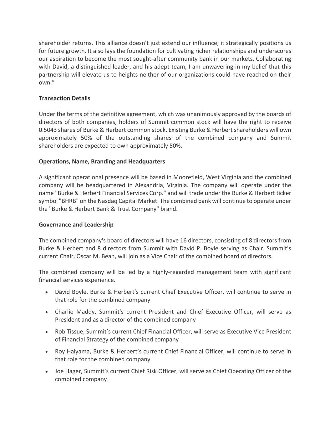 shareholder returns. This alliance doesn't just extend our influence; it strategically positions us  for future growth. It also lays the foundation for cultivating richer relationships and underscores  our aspiration to become the most sought‐after community bank in our markets. Collaborating  with David, a distinguished leader, and his adept team, I am unwavering in my belief that this  partnership will elevate us to heights neither of our organizations could have reached on their  own.”     Transaction Details    Under the terms of the definitive agreement, which was unanimously approved by the boards of  directors of both companies, holders of  Summit  common stock will have  the  right  to  receive  0.5043 shares of Burke & Herbert common stock. Existing Burke & Herbert shareholders will own  approximately  50%  of  the  outstanding  shares  of  the  combined  company  and  Summit  shareholders are expected to own approximately 50%.    Operations, Name, Branding and Headquarters    A significant operational presence will be based in Moorefield, West Virginia and the combined  company will  be  headquartered  in  Alexandria,  Virginia.  The  company will  operate  under  the  name "Burke & Herbert Financial Services Corp." and will trade under the Burke & Herbert ticker  symbol "BHRB" on the Nasdaq Capital Market. The combined bank will continue to operate under  the "Burke & Herbert Bank & Trust Company" brand.     Governance and Leadership    The combined company's board of directors will have 16 directors, consisting of 8 directors from  Burke & Herbert and 8 directors  from Summit with David P. Boyle serving as Chair. Summit’s  current Chair, Oscar M. Bean, will join as a Vice Chair of the combined board of directors.     The  combined  company  will  be  led  by  a  highly‐regarded management  team with  significant  financial services experience.   David Boyle, Burke & Herbert’s current Chief Executive Officer, will continue to serve in  that role for the combined company   Charlie  Maddy,  Summit's  current  President  and  Chief  Executive  Officer,  will  serve  as  President and as a director of the combined company   Rob Tissue, Summit’s current Chief Financial Officer, will serve as Executive Vice President  of Financial Strategy of the combined company   Roy Halyama, Burke & Herbert’s current Chief Financial Officer, will continue to serve in  that role for the combined company   Joe Hager, Summit’s current Chief Risk Officer, will serve as Chief Operating Officer of the  combined company