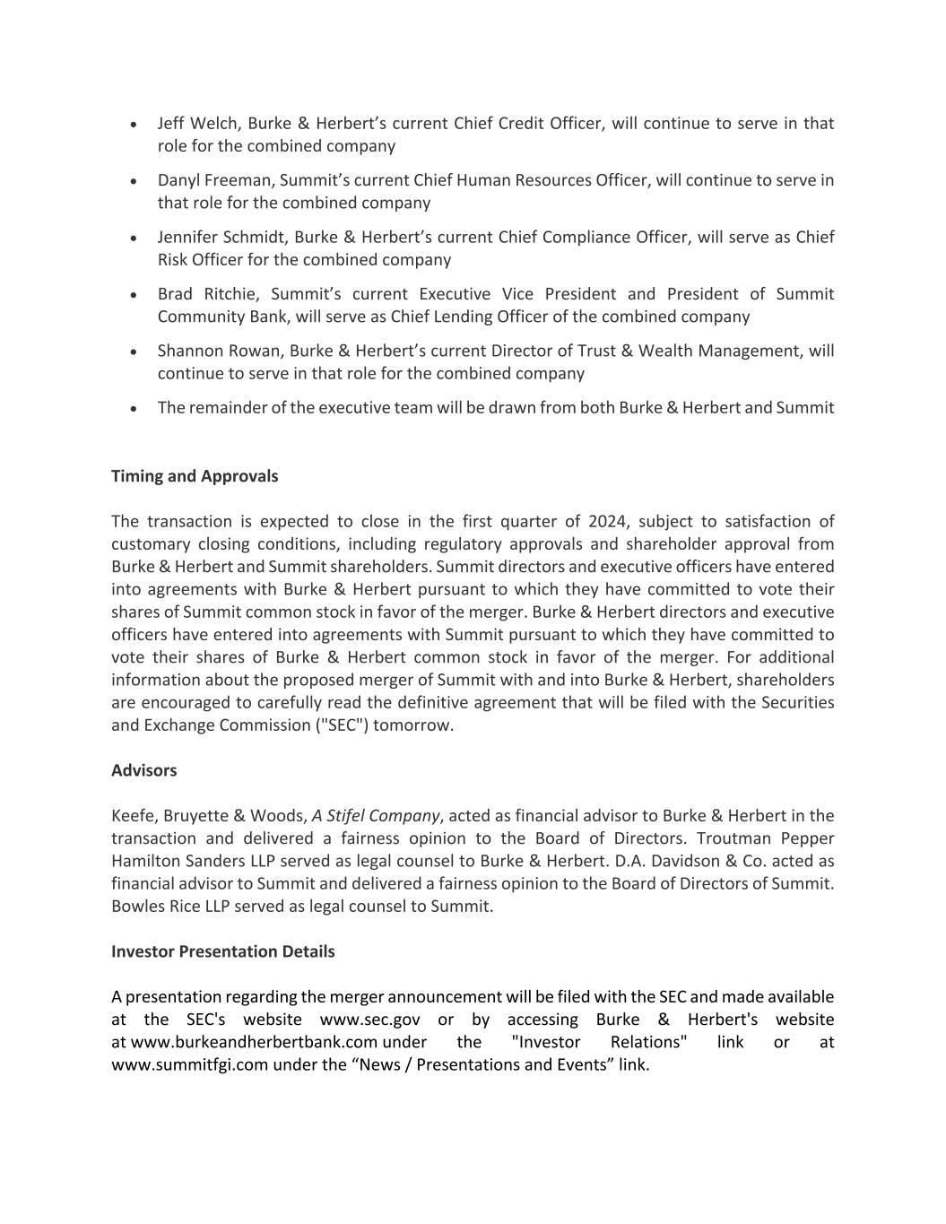  Jeff Welch, Burke & Herbert’s current Chief Credit Officer, will continue to serve in that  role for the combined company   Danyl Freeman, Summit’s current Chief Human Resources Officer, will continue to serve in  that role for the combined company   Jennifer Schmidt, Burke & Herbert’s current Chief Compliance Officer, will serve as Chief  Risk Officer for the combined company   Brad  Ritchie,  Summit’s  current  Executive  Vice  President  and  President  of  Summit  Community Bank, will serve as Chief Lending Officer of the combined company   Shannon Rowan, Burke & Herbert’s current Director of Trust & Wealth Management, will  continue to serve in that role for the combined company   The remainder of the executive team will be drawn from both Burke & Herbert and Summit    Timing and Approvals    The  transaction  is  expected  to  close  in  the  first  quarter  of  2024,  subject  to  satisfaction  of  customary  closing  conditions,  including  regulatory  approvals  and  shareholder  approval  from  Burke & Herbert and Summit shareholders. Summit directors and executive officers have entered  into agreements with Burke & Herbert pursuant  to which  they have committed  to vote  their  shares of Summit common stock in favor of the merger. Burke & Herbert directors and executive  officers have entered into agreements with Summit pursuant to which they have committed to  vote  their  shares  of  Burke  &  Herbert  common  stock  in  favor  of  the  merger.  For  additional  information about the proposed merger of Summit with and into Burke & Herbert, shareholders  are encouraged to carefully read the definitive agreement that will be filed with the Securities  and Exchange Commission ("SEC") tomorrow.    Advisors    Keefe, Bruyette & Woods, A Stifel Company, acted as financial advisor to Burke & Herbert in the  transaction  and  delivered  a  fairness  opinion  to  the  Board  of  Directors.  Troutman  Pepper  Hamilton Sanders LLP served as legal counsel to Burke & Herbert. D.A. Davidson & Co. acted as  financial advisor to Summit and delivered a fairness opinion to the Board of Directors of Summit.  Bowles Rice LLP served as legal counsel to Summit.      Investor Presentation Details    A presentation regarding the merger announcement will be filed with the SEC and made available  at  the  SEC's  website  www.sec.gov  or  by  accessing  Burke  &  Herbert's  website  at www.burkeandherbertbank.com under  the  "Investor  Relations"  link  or  at  www.summitfgi.com under the “News / Presentations and Events” link.