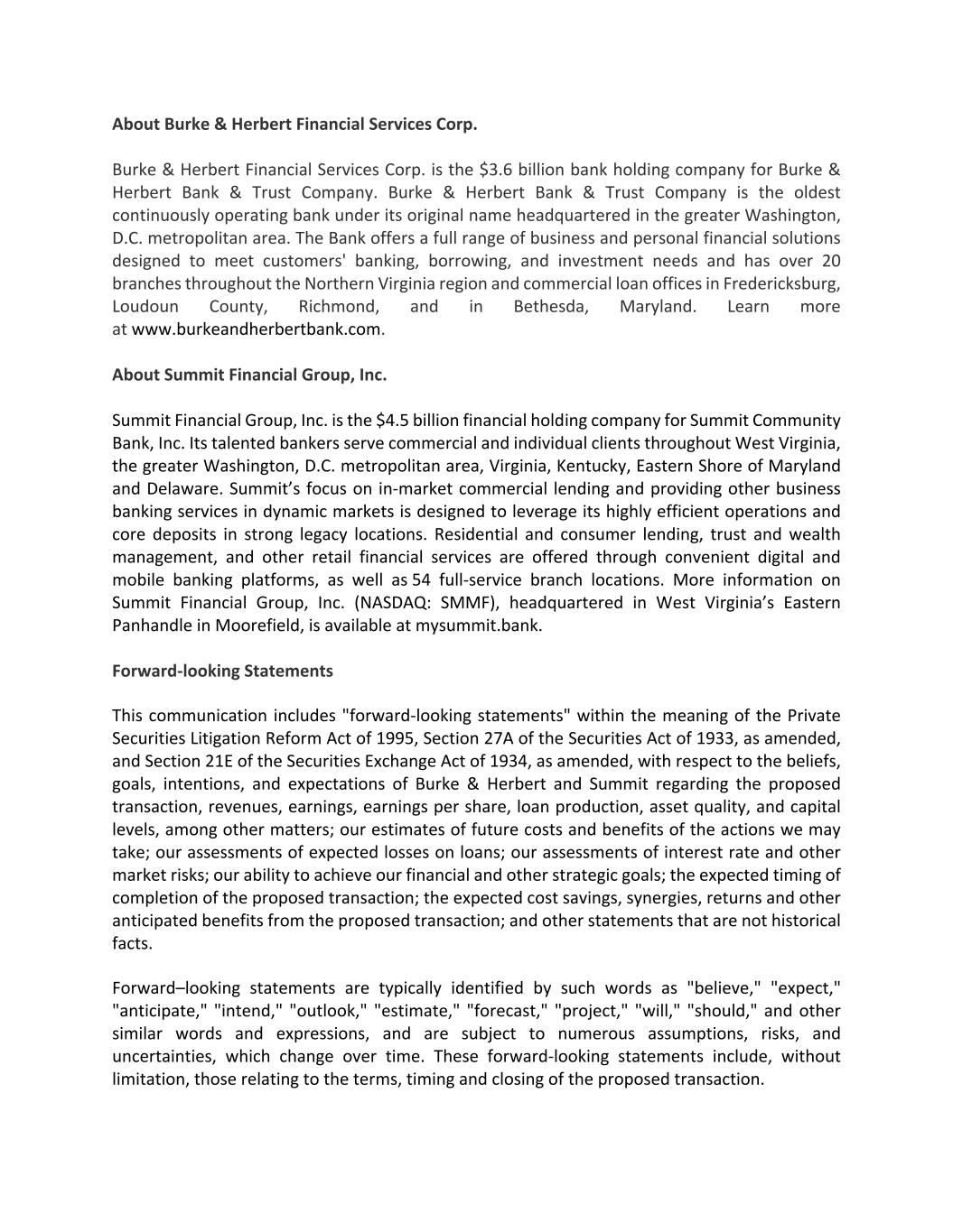 About Burke & Herbert Financial Services Corp.    Burke & Herbert Financial Services Corp. is the $3.6 billion bank holding company for Burke &  Herbert  Bank  &  Trust  Company.  Burke  &  Herbert  Bank  &  Trust  Company  is  the  oldest  continuously operating bank under its original name headquartered in the greater Washington,  D.C. metropolitan area. The Bank offers a full range of business and personal financial solutions  designed  to  meet  customers'  banking,  borrowing,  and  investment  needs  and  has  over  20  branches throughout the Northern Virginia region and commercial loan offices in Fredericksburg,  Loudoun  County,  Richmond,  and  in  Bethesda,  Maryland.  Learn  more  at www.burkeandherbertbank.com.    About Summit Financial Group, Inc.    Summit Financial Group, Inc. is the $4.5 billion financial holding company for Summit Community  Bank, Inc. Its talented bankers serve commercial and individual clients throughout West Virginia,  the greater Washington, D.C. metropolitan area, Virginia, Kentucky, Eastern Shore of Maryland  and Delaware. Summit’s  focus on  in‐market commercial  lending and providing other business  banking services in dynamic markets is designed to leverage its highly efficient operations and  core  deposits  in  strong  legacy  locations.  Residential  and  consumer  lending,  trust  and wealth  management,  and  other  retail  financial  services  are  offered  through  convenient  digital  and  mobile  banking  platforms,  as  well  as 54  full‐service  branch  locations.  More  information  on  Summit  Financial  Group,  Inc.  (NASDAQ:  SMMF),  headquartered  in  West  Virginia’s  Eastern  Panhandle in Moorefield, is available at mysummit.bank.    Forward‐looking Statements  This communication  includes "forward‐looking statements" within the meaning of  the Private  Securities Litigation Reform Act of 1995, Section 27A of the Securities Act of 1933, as amended,  and Section 21E of the Securities Exchange Act of 1934, as amended, with respect to the beliefs,  goals,  intentions,  and  expectations  of  Burke  &  Herbert  and  Summit  regarding  the  proposed  transaction, revenues, earnings, earnings per share, loan production, asset quality, and capital  levels, among other matters; our estimates of future costs and benefits of the actions we may  take; our assessments of expected losses on loans; our assessments of interest rate and other  market risks; our ability to achieve our financial and other strategic goals; the expected timing of  completion of the proposed transaction; the expected cost savings, synergies, returns and other  anticipated benefits from the proposed transaction; and other statements that are not historical  facts.  Forward–looking  statements  are  typically  identified  by  such  words  as  "believe,"  "expect,"  "anticipate,"  "intend,"  "outlook,"  "estimate,"  "forecast,"  "project,"  "will,"  "should,"  and other  similar  words  and  expressions,  and  are  subject  to  numerous  assumptions,  risks,  and  uncertainties,  which  change  over  time.  These  forward‐looking  statements  include,  without  limitation, those relating to the terms, timing and closing of the proposed transaction.