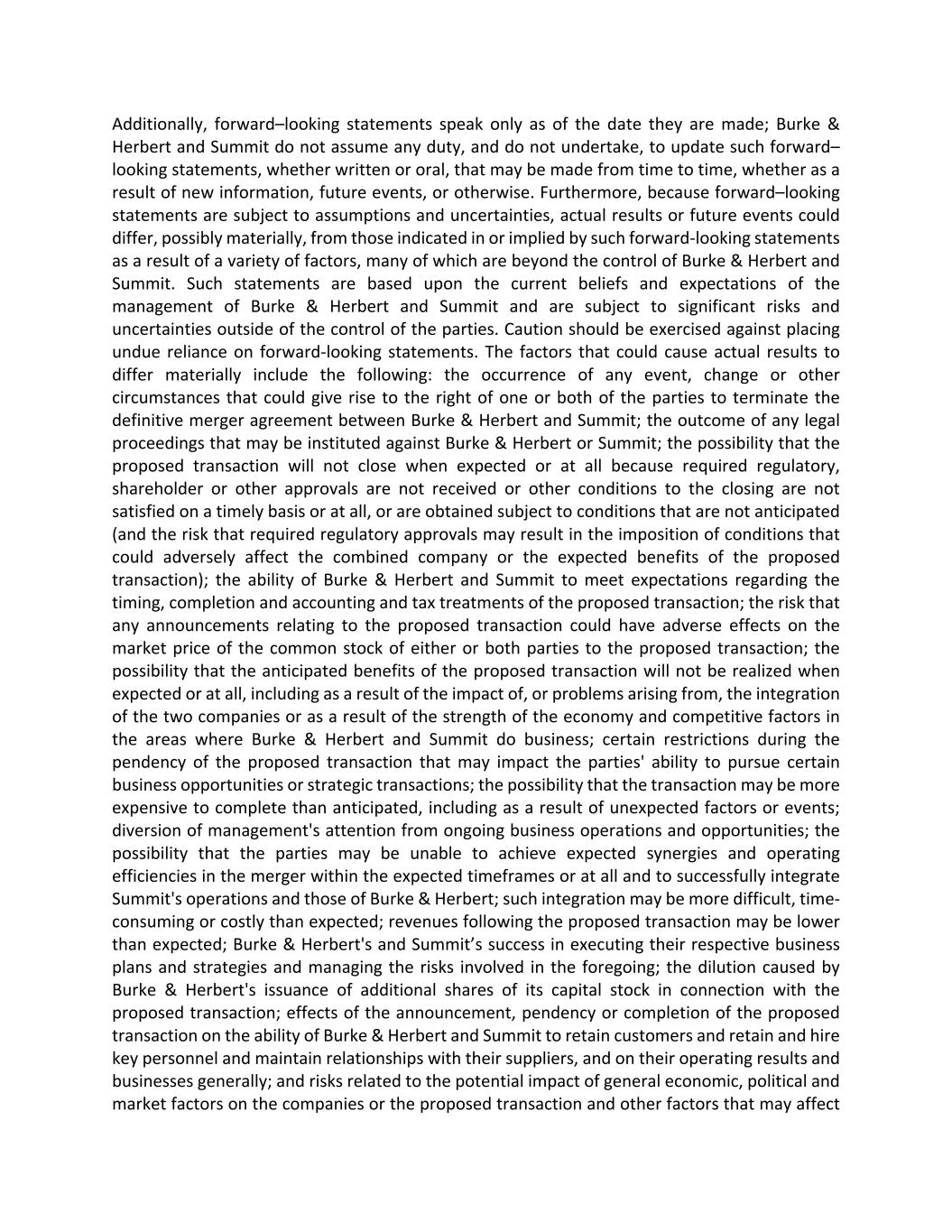 Additionally,  forward–looking  statements  speak  only  as  of  the  date  they  are made;  Burke &  Herbert and Summit do not assume any duty, and do not undertake, to update such forward– looking statements, whether written or oral, that may be made from time to time, whether as a  result of new information, future events, or otherwise. Furthermore, because forward–looking  statements are subject to assumptions and uncertainties, actual results or future events could  differ, possibly materially, from those indicated in or implied by such forward‐looking statements  as a result of a variety of factors, many of which are beyond the control of Burke & Herbert and  Summit.  Such  statements  are  based  upon  the  current  beliefs  and  expectations  of  the  management  of  Burke  &  Herbert  and  Summit  and  are  subject  to  significant  risks  and  uncertainties outside of the control of the parties. Caution should be exercised against placing  undue  reliance on  forward‐looking  statements.  The  factors  that  could  cause actual  results  to  differ  materially  include  the  following:  the  occurrence  of  any  event,  change  or  other  circumstances  that could give  rise  to  the right of one or both of  the parties  to  terminate  the  definitive merger agreement between Burke & Herbert and Summit; the outcome of any legal  proceedings that may be instituted against Burke & Herbert or Summit; the possibility that the  proposed  transaction  will  not  close  when  expected  or  at  all  because  required  regulatory,  shareholder  or  other  approvals  are  not  received  or  other  conditions  to  the  closing  are  not  satisfied on a timely basis or at all, or are obtained subject to conditions that are not anticipated  (and the risk that required regulatory approvals may result in the imposition of conditions that  could  adversely  affect  the  combined  company  or  the  expected  benefits  of  the  proposed  transaction);  the  ability  of  Burke & Herbert  and  Summit  to meet  expectations  regarding  the  timing, completion and accounting and tax treatments of the proposed transaction; the risk that  any  announcements  relating  to  the  proposed  transaction  could  have  adverse  effects  on  the  market price of  the common stock of either or both parties  to  the proposed transaction;  the  possibility that the anticipated benefits of the proposed transaction will not be realized when  expected or at all, including as a result of the impact of, or problems arising from, the integration  of the two companies or as a result of the strength of the economy and competitive factors in  the  areas  where  Burke  &  Herbert  and  Summit  do  business;  certain  restrictions  during  the  pendency  of  the  proposed  transaction  that may  impact  the  parties'  ability  to  pursue  certain  business opportunities or strategic transactions; the possibility that the transaction may be more  expensive to complete than anticipated, including as a result of unexpected factors or events;  diversion of management's attention from ongoing business operations and opportunities; the  possibility  that  the  parties  may  be  unable  to  achieve  expected  synergies  and  operating  efficiencies in the merger within the expected timeframes or at all and to successfully integrate  Summit's operations and those of Burke & Herbert; such integration may be more difficult, time‐ consuming or costly than expected; revenues following the proposed transaction may be lower  than expected; Burke & Herbert's and Summit’s success in executing their respective business  plans and strategies and managing  the risks  involved  in  the  foregoing;  the dilution caused by  Burke  &  Herbert's  issuance  of  additional  shares  of  its  capital  stock  in  connection  with  the  proposed transaction; effects of the announcement, pendency or completion of the proposed  transaction on the ability of Burke & Herbert and Summit to retain customers and retain and hire  key personnel and maintain relationships with their suppliers, and on their operating results and  businesses generally; and risks related to the potential impact of general economic, political and  market factors on the companies or the proposed transaction and other factors that may affect