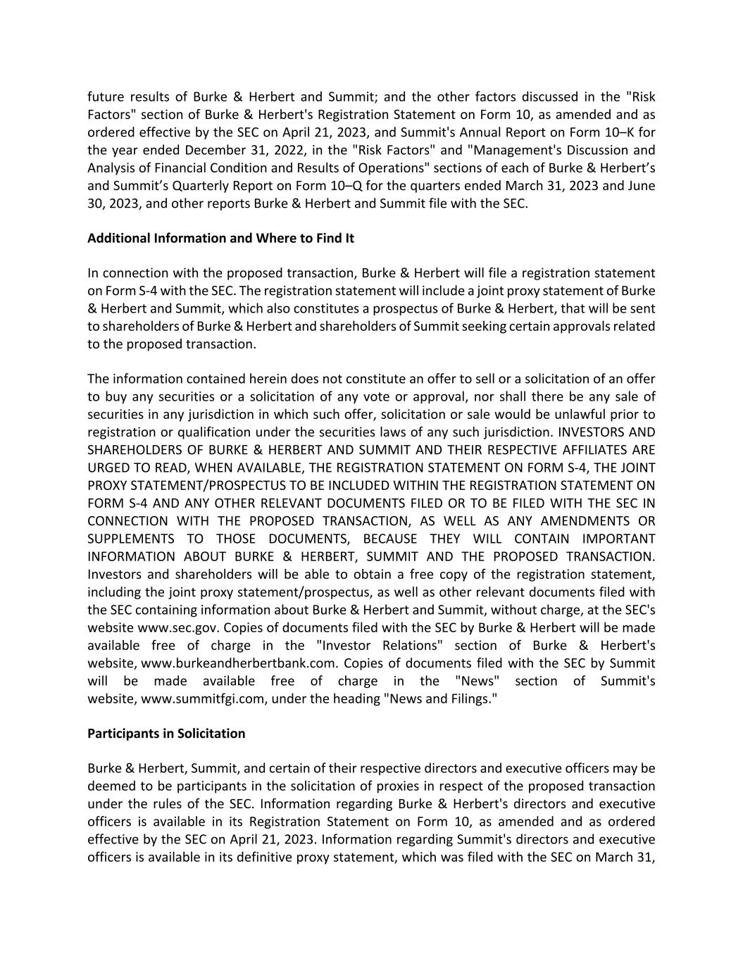 future  results  of  Burke  &  Herbert  and  Summit;  and  the  other  factors  discussed  in  the  "Risk  Factors" section of Burke & Herbert's Registration Statement on Form 10, as amended and as  ordered effective by the SEC on April 21, 2023, and Summit's Annual Report on Form 10–K for  the year ended December 31, 2022,  in  the "Risk Factors" and "Management's Discussion and  Analysis of Financial Condition and Results of Operations" sections of each of Burke & Herbert’s  and Summit’s Quarterly Report on Form 10–Q for the quarters ended March 31, 2023 and June  30, 2023, and other reports Burke & Herbert and Summit file with the SEC.   Additional Information and Where to Find It  In connection with the proposed transaction, Burke & Herbert will file a registration statement  on Form S‐4 with the SEC. The registration statement will include a joint proxy statement of Burke  & Herbert and Summit, which also constitutes a prospectus of Burke & Herbert, that will be sent  to shareholders of Burke & Herbert and shareholders of Summit seeking certain approvals related  to the proposed transaction.  The information contained herein does not constitute an offer to sell or a solicitation of an offer  to buy  any  securities or  a  solicitation of  any  vote or  approval,  nor  shall  there be  any  sale of  securities in any jurisdiction in which such offer, solicitation or sale would be unlawful prior to  registration or qualification under the securities laws of any such jurisdiction. INVESTORS AND  SHAREHOLDERS OF BURKE & HERBERT AND SUMMIT AND THEIR RESPECTIVE AFFILIATES ARE  URGED TO READ, WHEN AVAILABLE, THE REGISTRATION STATEMENT ON FORM S‐4, THE JOINT  PROXY STATEMENT/PROSPECTUS TO BE INCLUDED WITHIN THE REGISTRATION STATEMENT ON  FORM S‐4 AND ANY OTHER RELEVANT DOCUMENTS FILED OR TO BE FILED WITH THE SEC  IN  CONNECTION  WITH  THE  PROPOSED  TRANSACTION,  AS  WELL  AS  ANY  AMENDMENTS  OR  SUPPLEMENTS  TO  THOSE  DOCUMENTS,  BECAUSE  THEY  WILL  CONTAIN  IMPORTANT  INFORMATION  ABOUT  BURKE  &  HERBERT,  SUMMIT  AND  THE  PROPOSED  TRANSACTION.  Investors  and  shareholders  will  be  able  to  obtain  a  free  copy  of  the  registration  statement,  including the joint proxy statement/prospectus, as well as other relevant documents filed with  the SEC containing information about Burke & Herbert and Summit, without charge, at the SEC's  website www.sec.gov. Copies of documents filed with the SEC by Burke & Herbert will be made  available  free  of  charge  in  the  "Investor  Relations"  section  of  Burke  &  Herbert's  website, www.burkeandherbertbank.com. Copies of documents  filed with  the SEC by Summit  will  be  made  available  free  of  charge  in  the  "News"  section  of  Summit's  website, www.summitfgi.com, under the heading "News and Filings."  Participants in Solicitation  Burke & Herbert, Summit, and certain of their respective directors and executive officers may be  deemed to be participants in the solicitation of proxies in respect of the proposed transaction  under  the  rules  of  the  SEC.  Information  regarding  Burke & Herbert's  directors  and  executive  officers  is  available  in  its  Registration  Statement  on  Form  10,  as  amended  and  as  ordered  effective by the SEC on April 21, 2023. Information regarding Summit's directors and executive  officers is available in its definitive proxy statement, which was filed with the SEC on March 31,