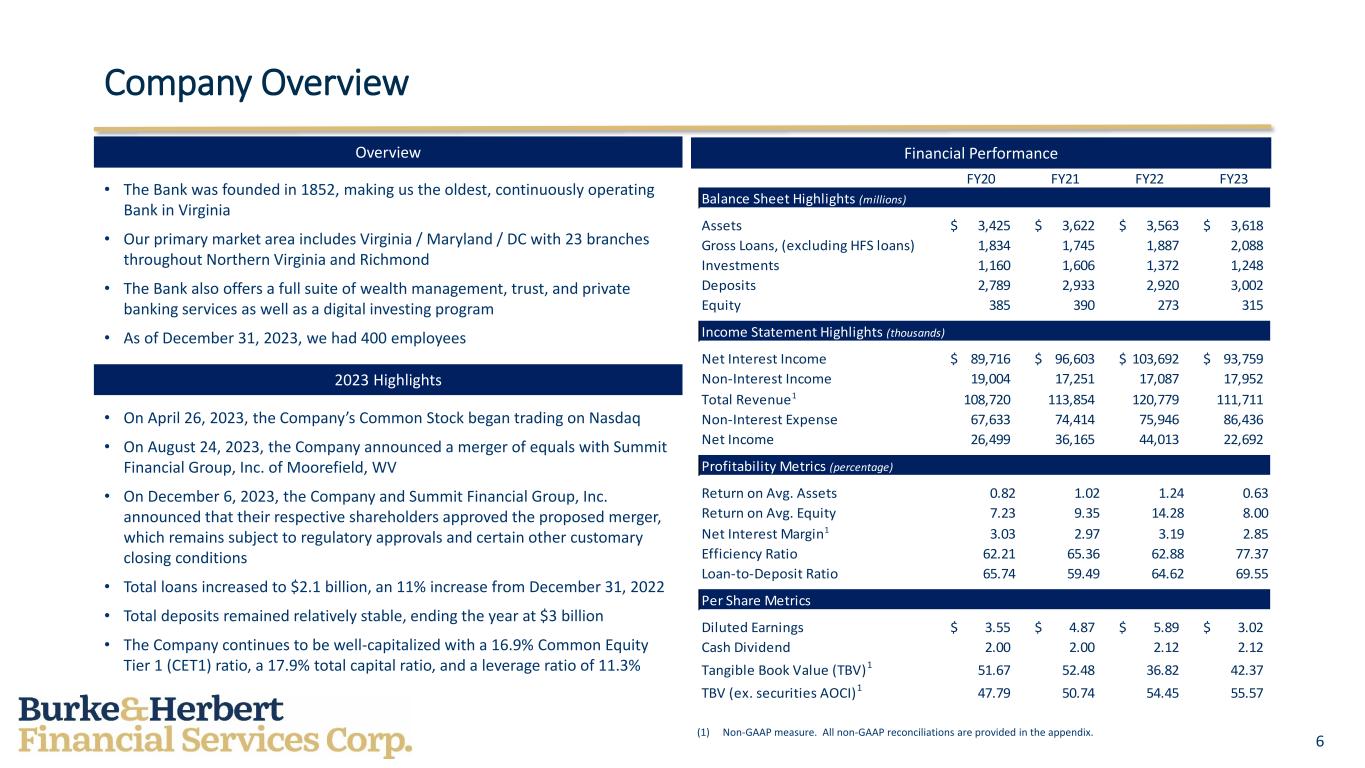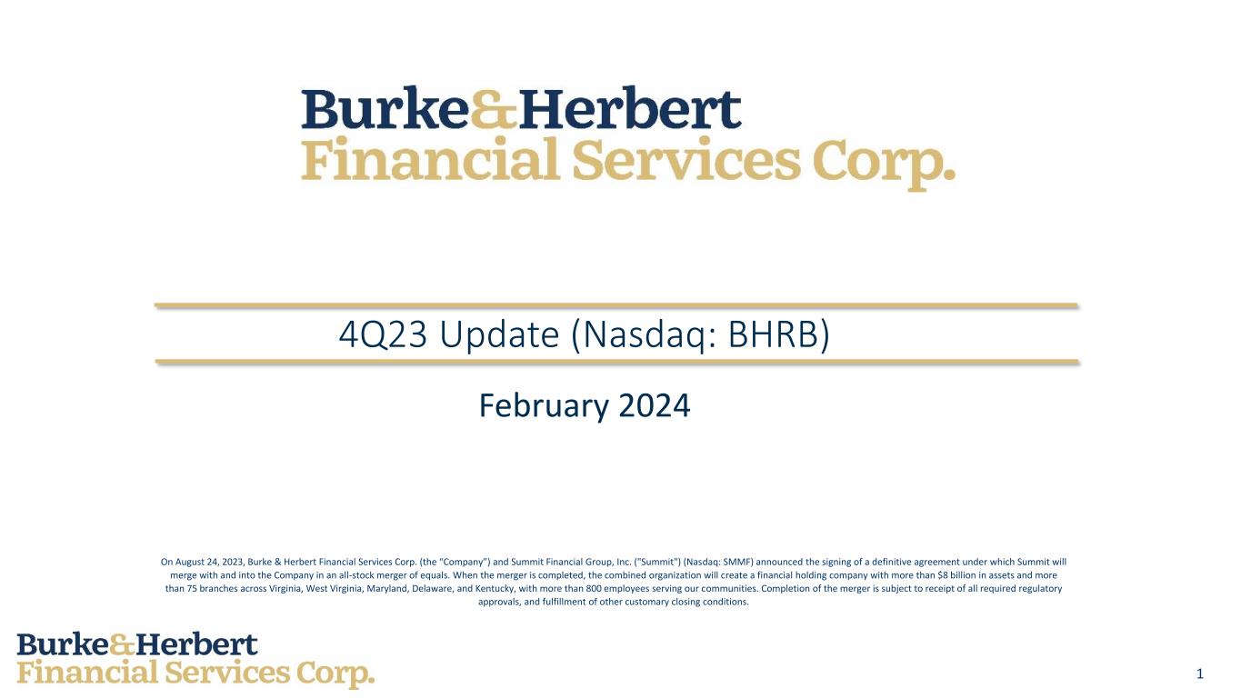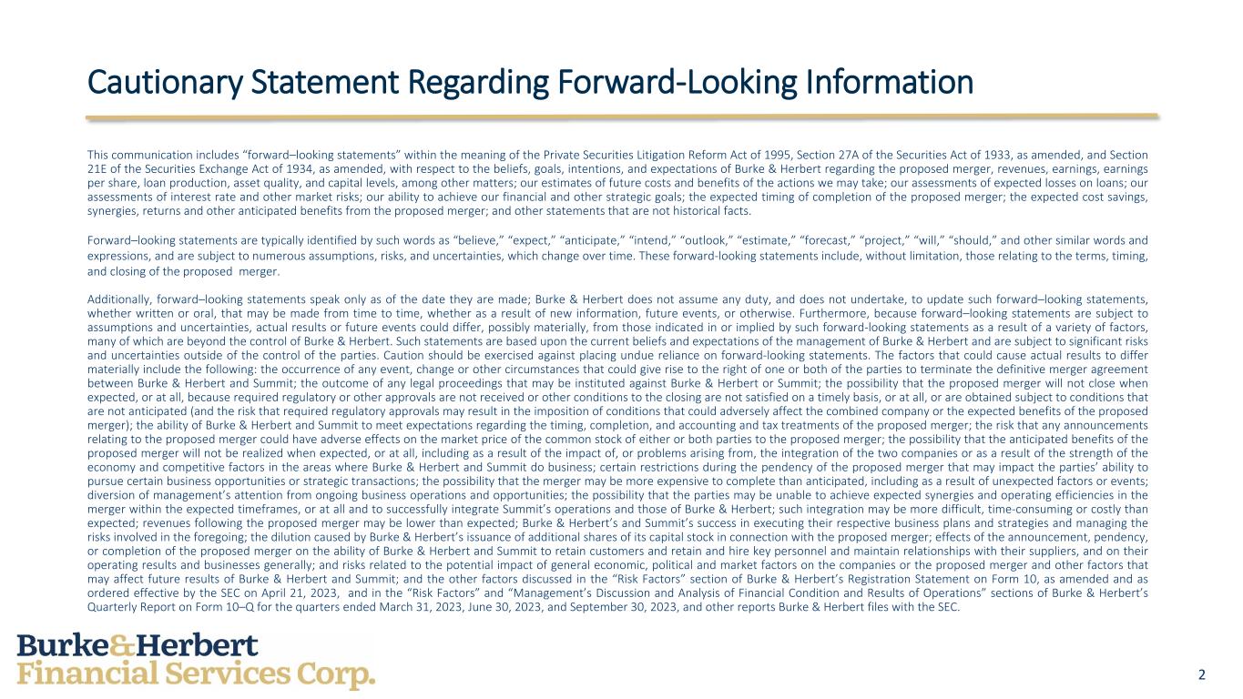 1 4Q23 Update (Nasdaq: BHRB) February 2024 On August 24, 2023, Burke & Herbert Financial Services Corp. (the “Company”) and Summit Financial Group, Inc. ("Summit") (Nasdaq: SMMF) announced the signing of a definitive agreement under which Summit will merge with and into the Company in an all-stock merger of equals. When the merger is completed, the combined organization will create a financial holding company with more than $8 billion in assets and more than 75 branches across Virginia, West Virginia, Maryland, Delaware, and Kentucky, with more than 800 employees serving our communities. Completion of the merger is subject to receipt of all required regulatory approvals, and fulfillment of other customary closing conditions.
