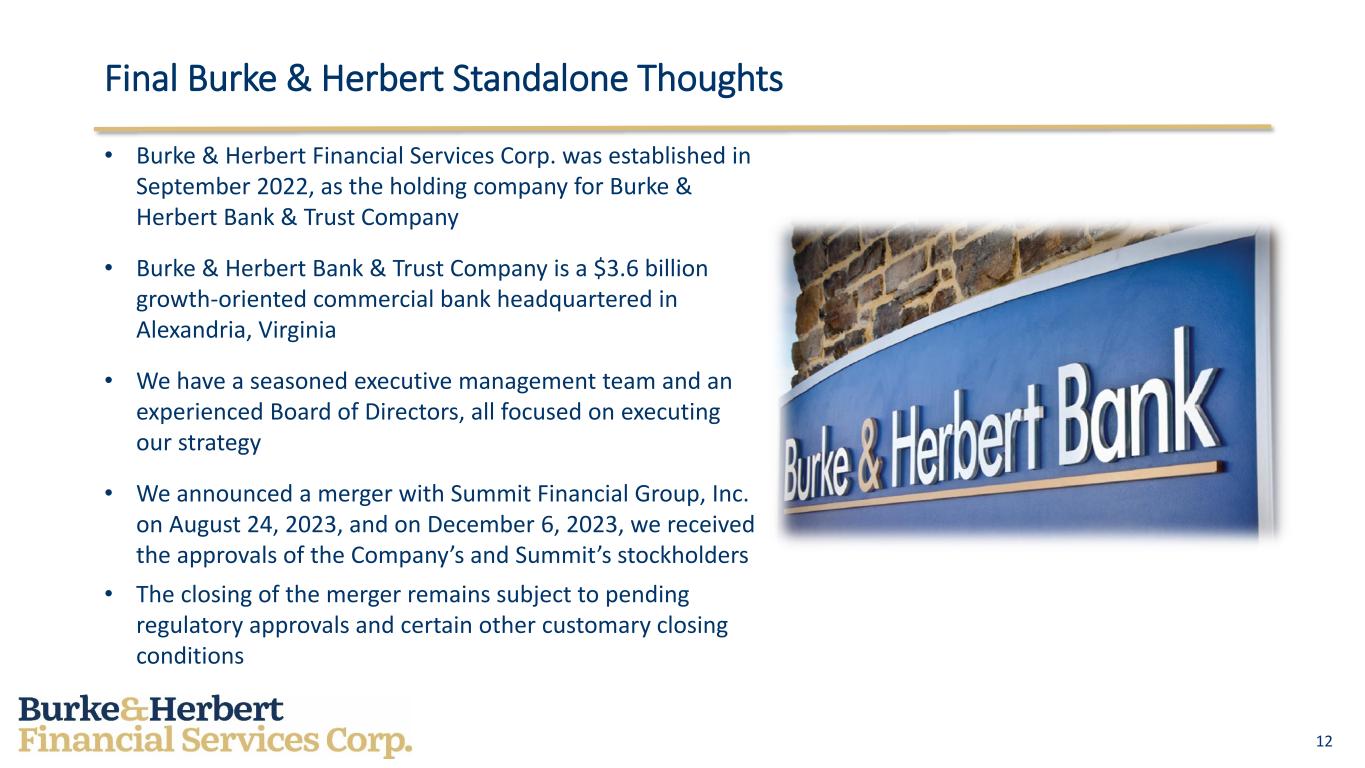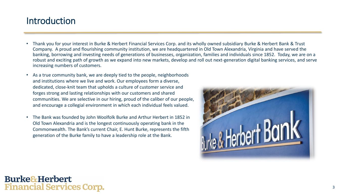 2 Cautionary Statement Regarding Forward-Looking Information This communication includes “forward–looking statements” within the meaning of the Private Securities Litigation Reform Act of 1995, Section 27A of the Securities Act of 1933, as amended, and Section 21E of the Securities Exchange Act of 1934, as amended, with respect to the beliefs, goals, intentions, and expectations of Burke & Herbert regarding the proposed merger, revenues, earnings, earnings per share, loan production, asset quality, and capital levels, among other matters; our estimates of future costs and benefits of the actions we may take; our assessments of expected losses on loans; our assessments of interest rate and other market risks; our ability to achieve our financial and other strategic goals; the expected timing of completion of the proposed merger; the expected cost savings, synergies, returns and other anticipated benefits from the proposed merger; and other statements that are not historical facts. Forward–looking statements are typically identified by such words as “believe,” “expect,” “anticipate,” “intend,” “outlook,” “estimate,” “forecast,” “project,” “will,” “should,” and other similar words and expressions, and are subject to numerous assumptions, risks, and uncertainties, which change over time. These forward-looking statements include, without limitation, those relating to the terms, timing, and closing of the proposed merger. Additionally, forward–looking statements speak only as of the date they are made; Burke & Herbert does not assume any duty, and does not undertake, to update such forward–looking statements, whether written or oral, that may be made from time to time, whether as a result of new information, future events, or otherwise. Furthermore, because forward–looking statements are subject to assumptions and uncertainties, actual results or future events could differ, possibly materially, from those indicated in or implied by such forward-looking statements as a result of a variety of factors, many of which are beyond the control of Burke & Herbert. Such statements are based upon the current beliefs and expectations of the management of Burke & Herbert and are subject to significant risks and uncertainties outside of the control of the parties. Caution should be exercised against placing undue reliance on forward-looking statements. The factors that could cause actual results to differ materially include the following: the occurrence of any event, change or other circumstances that could give rise to the right of one or both of the parties to terminate the definitive merger agreement between Burke & Herbert and Summit; the outcome of any legal proceedings that may be instituted against Burke & Herbert or Summit; the possibility that the proposed merger will not close when expected, or at all, because required regulatory or other approvals are not received or other conditions to the closing are not satisfied on a timely basis, or at all, or are obtained subject to conditions that are not anticipated (and the risk that required regulatory approvals may result in the imposition of conditions that could adversely affect the combined company or the expected benefits of the proposed merger); the ability of Burke & Herbert and Summit to meet expectations regarding the timing, completion, and accounting and tax treatments of the proposed merger; the risk that any announcements relating to the proposed merger could have adverse effects on the market price of the common stock of either or both parties to the proposed merger; the possibility that the anticipated benefits of the proposed merger will not be realized when expected, or at all, including as a result of the impact of, or problems arising from, the integration of the two companies or as a result of the strength of the economy and competitive factors in the areas where Burke & Herbert and Summit do business; certain restrictions during the pendency of the proposed merger that may impact the parties’ ability to pursue certain business opportunities or strategic transactions; the possibility that the merger may be more expensive to complete than anticipated, including as a result of unexpected factors or events; diversion of management’s attention from ongoing business operations and opportunities; the possibility that the parties may be unable to achieve expected synergies and operating efficiencies in the merger within the expected timeframes, or at all and to successfully integrate Summit’s operations and those of Burke & Herbert; such integration may be more difficult, time-consuming or costly than expected; revenues following the proposed merger may be lower than expected; Burke & Herbert’s and Summit’s success in executing their respective business plans and strategies and managing the risks involved in the foregoing; the dilution caused by Burke & Herbert’s issuance of additional shares of its capital stock in connection with the proposed merger; effects of the announcement, pendency, or completion of the proposed merger on the ability of Burke & Herbert and Summit to retain customers and retain and hire key personnel and maintain relationships with their suppliers, and on their operating results and businesses generally; and risks related to the potential impact of general economic, political and market factors on the companies or the proposed merger and other factors that may affect future results of Burke & Herbert and Summit; and the other factors discussed in the “Risk Factors” section of Burke & Herbert’s Registration Statement on Form 10, as amended and as ordered effective by the SEC on April 21, 2023, and in the “Risk Factors” and “Management’s Discussion and Analysis of Financial Condition and Results of Operations” sections of Burke & Herbert’s Quarterly Report on Form 10–Q for the quarters ended March 31, 2023, June 30, 2023, and Septembe
