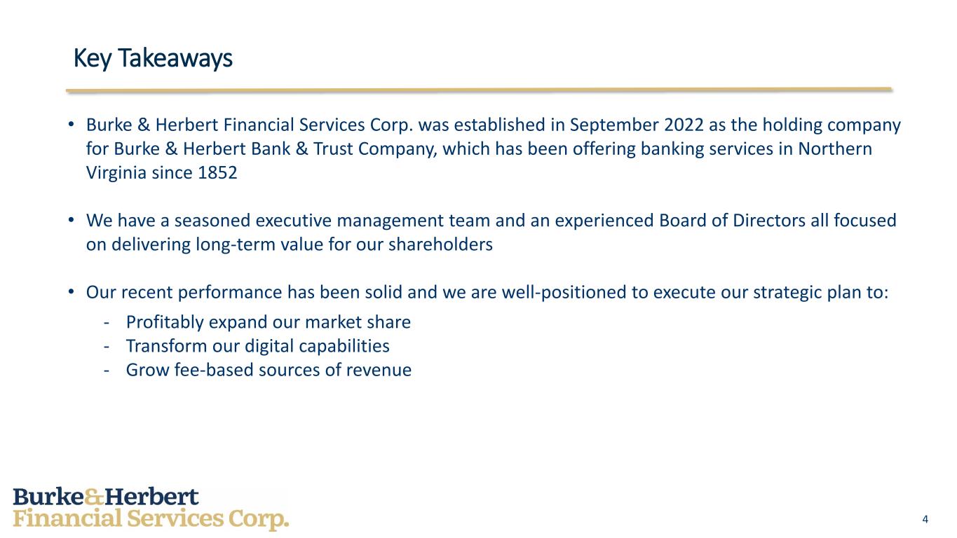 3 Introduction • Thank you for your interest in Burke & Herbert Financial Services Corp. and its wholly owned subsidiary Burke & Herbert Bank & Trust Company. A proud and flourishing community institution, we are headquartered in Old Town Alexandria, Virginia and have served the banking, borrowing and investing needs of generations of businesses, organization, families and individuals since 1852. Today, we are on a robust and exciting path of growth as we expand into new markets, develop and roll out next-generation digital banking services, and serve increasing numbers of customers. • As a true community bank, we are deeply tied to the people, neighborhoods and institutions where we live and work. Our employees form a diverse, dedicated, close-knit team that upholds a culture of customer service and forges strong and lasting relationships with our customers and shared communities. We are selective in our hiring, proud of the caliber of our people, and encourage a collegial environment in which each individual feels valued. • The Bank was founded by John Woolfolk Burke and Arthur Herbert in 1852 in Old Town Alexandria and is the longest continuously operating bank in the Commonwealth. The Bank’s current Chair, E. Hunt Burke, represents the fifth generation of the Burke family to have a leadership role at the Bank.