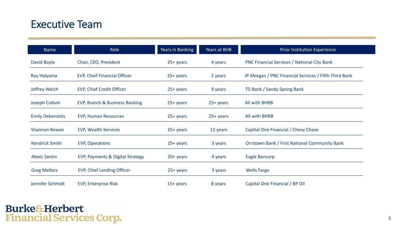 4 Key Takeaways • Burke & Herbert Financial Services Corp. was established in September 2022 as the holding company for Burke & Herbert Bank & Trust Company, which has been offering banking services in Northern Virginia since 1852 • We have a seasoned executive management team and an experienced Board of Directors all focused on delivering long-term value for our shareholders • Our recent performance has been solid and we are well-positioned to execute our strategic plan to: - Profitably expand our market share - Transform our digital capabilities - Grow fee-based sources of revenue