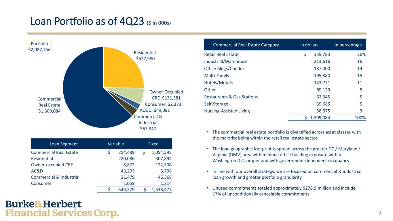 6 Company Overview • The Bank was founded in 1852, making us the oldest, continuously operating Bank in Virginia • Our primary market area includes Virginia / Maryland / DC with 23 branches throughout Northern Virginia and Richmond • The Bank also offers a full suite of wealth management, trust, and private banking services as well as a digital investing program • As of December 31, 2023, we had 400 employees Overview Financial Performance (1) Non-GAAP measure. All non-GAAP reconciliations are provided in the appendix. 2023 Highlights • On April 26, 2023, the Company’s Common Stock began trading on Nasdaq • On August 24, 2023, the Company announced a merger of equals with Summit Financial Group, Inc. of Moorefield, WV • On December 6, 2023, the Company and Summit Financial Group, Inc. announced that their respective shareholders approved the proposed merger, which remains subject to regulatory approvals and certain other customary closing conditions • Total loans increased to $2.1 billion, an 11% increase from December 31, 2022 • Total deposits remained relatively stable, ending the year at $3 billion • The Company continues to be well-capitalized with a 16.9% Common Equity Tier 1 (CET1) ratio, a 17.9% total capital ratio, and a leverage ratio of 11.3% FY20 FY21 FY22 FY23 Assets 3,425$ 3,622$ 3,563$ 3,618$ Gross Loans, (excluding HFS loans) 1,834 1,745 1,887 2,088 Investments 1,160 1,606 1,372 1,248 Deposits 2,789 2,933 2,920 3,002 Equity 385 390 273 315 Net Interest Income 89,716$ 96,603$ 103,692$ 93,759$ Non-Interest Income 19,004 17,251 17,087 17,952 Total Revenue1 108,720 113,854 120,779 111,711 Non-Interest Expense 67,633 74,414 75,946 86,436 Net Income 26,499 36,165 44,013 22,692 Return on Avg. Assets 0.82 1.02 1.24 0.63 Return on Avg. Equity 7.23 9.35 14.28 8.00 Net Interest Margin1 3.03 2.97 3.19 2.85 Efficiency Ratio 62.21 65.36 62.88 77.37 Loan-to-Deposit Ratio 65.74 59.49 64.62 69.55 Diluted Earnings 3.55$ 4.87$ 5.89$ 3.02$ Cash Dividend 2.00 2.00 2.12 2.12 Tangible Book Value (TBV)1 51.67 52.48 36.82 42.37 TBV (ex. securities AOCI)1 47.79 50.74 54.45 55.57 Balance Sheet Highlights (millions) Income Statement Highlights (thousands) Profitability Metrics (percentage) Per Share Metrics