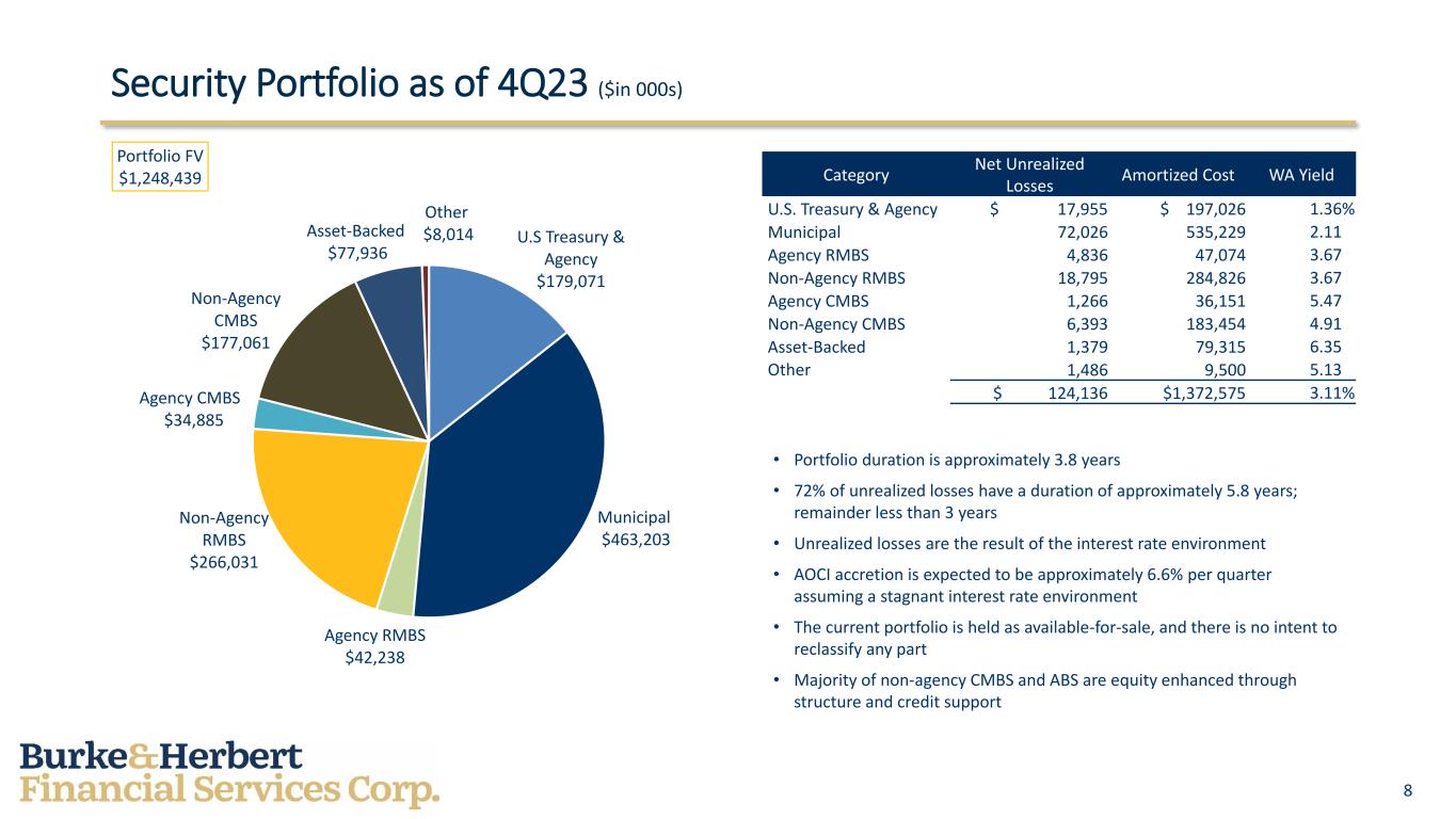 7 Loan Portfolio as of 4Q23 ($ in 000s) Residential $527,980 Owner-Occupied CRE $131,381 Consumer $2,373 AC&D $49,091 Commercial & Industrial $67,847 Commercial Real Estate $1,309,084 Portfolio $2,087,756 Loan Segment Variable Fixed Commercial Real Estate $ 254,489 $ 1,054,595 Residential 220,086 307,894 Owner-occupied CRE 8,873 122,508 AC&D 43,293 5,798 Commercial & Industrial 21,479 46,368 Consumer 1,059 1,314 $ 549,279 $ 1,538,477 • The commercial real estate portfolio is diversified across asset classes with the majority being within the retail real estate sector • The loan geographic footprint is spread across the greater DC / Maryland / Virginia (DMV) area with minimal office building exposure within Washington D.C. proper and with government-dependent occupancy • In line with our overall strategy, we are focused on commercial & industrial loan growth and greater portfolio granularity • Unused commitments totaled approximately $278.9 million and include 17% of unconditionally cancelable commitments Commercial Real Estate Category in dollars in percentage Retail Real Estate $ 339,783 26% Industrial/Warehouse 213,616 16% Office Bldgs/Condos 187,000 14% Multi-Family 195,380 15% Hotels/Motels 143,771 11% Other 69,129 5% Restaurants & Gas Stations 62,345 5% Self-Storage 59,685 5% Nursing-Assisted Living 38,375 3% $ 1,309,084 100%