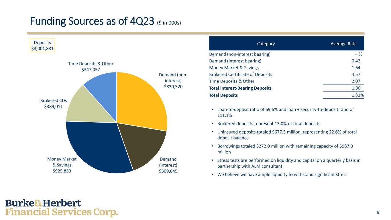 8 Security Portfolio as of 4Q23 ($in 000s) U.S Treasury & Agency $179,071 Municipal $463,203 Agency RMBS $42,238 Non-Agency RMBS $266,031 Agency CMBS $34,885 Non-Agency CMBS $177,061 Asset-Backed $77,936 Other $8,014 Portfolio FV $1,248,439 • Portfolio duration is approximately 3.8 years • 72% of unrealized losses have a duration of approximately 5.8 years; remainder less than 3 years • Unrealized losses are the result of the interest rate environment • AOCI accretion is expected to be approximately 6.6% per quarter assuming a stagnant interest rate environment • The current portfolio is held as available-for-sale, and there is no intent to reclassify any part • Majority of non-agency CMBS and ABS are equity enhanced through structure and credit support Category Net Unrealized Losses Amortized Cost WA Yield U.S. Treasury & Agency $ 17,955 $ 197,026 1.36% Municipal 72,026 535,229 2.11% Agency RMBS 4,836 47,074 3.67% Non-Agency RMBS 18,795 284,826 3.67% Agency CMBS 1,266 36,151 5.47% Non-Agency CMBS 6,393 183,454 4.91% Asset-Backed 1,379 79,315 6.35% Other 1,486 9,500 5.13% $ 124,136 $1,372,575 3.11%