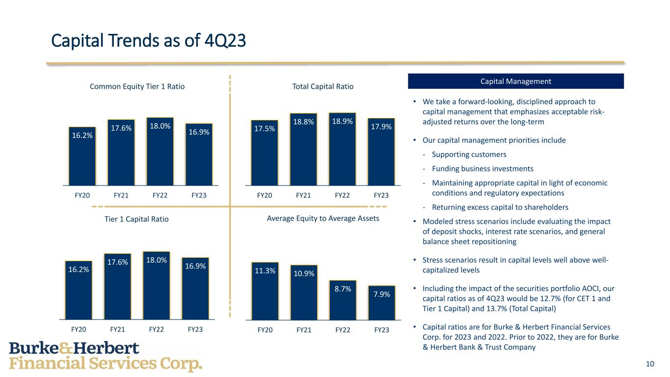 9 Funding Sources as of 4Q23 ($ in 000s) Demand (non- interest) $830,320 Demand (interest) $509,645 Money Market & Savings $925,853 Brokered CDs $389,011 Time Deposits & Other $347,052 Deposits $3,001,881 Category Average Rate Demand (non-interest bearing) − % Demand (interest bearing) 0.42% Money Market & Savings 1.64% Brokered Certificate of Deposits 4.57% Time Deposits & Other 2.07% Total Interest-Bearing Deposits 1.86% Total Deposits 1.31% • Loan-to-deposit ratio of 69.6% and loan + security-to-deposit ratio of 111.1% • Brokered deposits represent 13.0% of total deposits • Uninsured deposits totaled $677.3 million, representing 22.6% of total deposit balance • Borrowings totaled $272.0 million with remaining capacity of $987.0 million • Stress tests are performed on liquidity and capital on a quarterly basis in partnership with ALM consultant • We believe we have ample liquidity to withstand significant stress