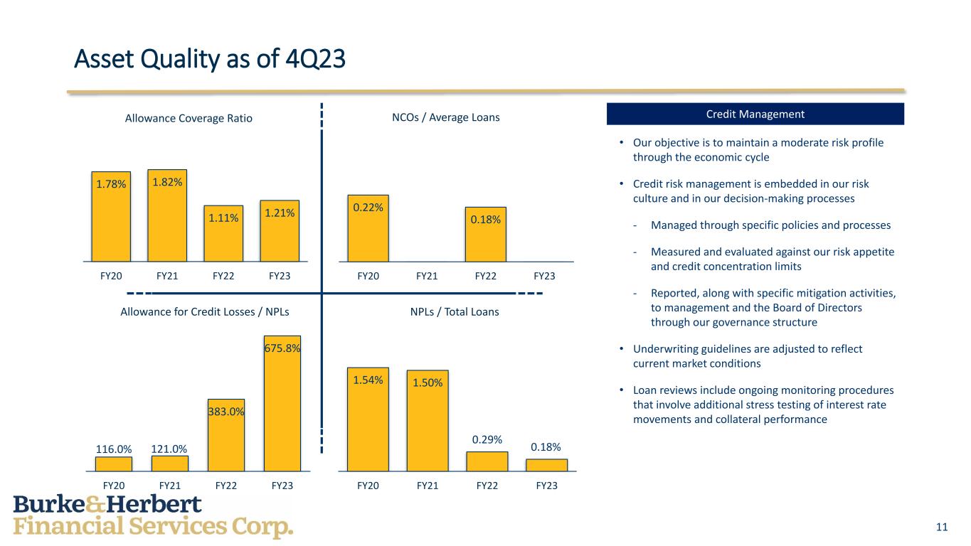 10 Capital Trends as of 4Q23 16.2% 17.6% 18.0% 16.9% FY20 FY21 FY22 FY23 Common Equity Tier 1 Ratio 16.2% 17.6% 18.0% 16.9% FY20 FY21 FY22 FY23 Tier 1 Capital Ratio 17.5% 18.8% 18.9% 17.9% FY20 FY21 FY22 FY23 Total Capital Ratio 11.3% 10.9% 8.7% 7.9% FY20 FY21 FY22 FY23 Average Equity to Average Assets Capital Management • We take a forward-looking, disciplined approach to capital management that emphasizes acceptable risk- adjusted returns over the long-term • Our capital management priorities include - Supporting customers - Funding business investments - Maintaining appropriate capital in light of economic conditions and regulatory expectations - Returning excess capital to shareholders • Modeled stress scenarios include evaluating the impact of deposit shocks, interest rate scenarios, and general balance sheet repositioning • Stress scenarios result in capital levels well above well- capitalized levels • Including the impact of the securities portfolio AOCI, our capital ratios as of 4Q23 would be 12.7% (for CET 1 and Tier 1 Capital) and 13.7% (Total Capital) • Capital ratios are for Burke & Herbert Financial Services Corp. for 2023 and 2022. Prior to 2022, they are for Burke & Herbert Bank & Trust Company