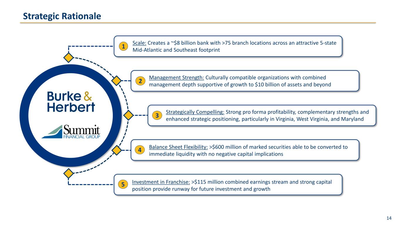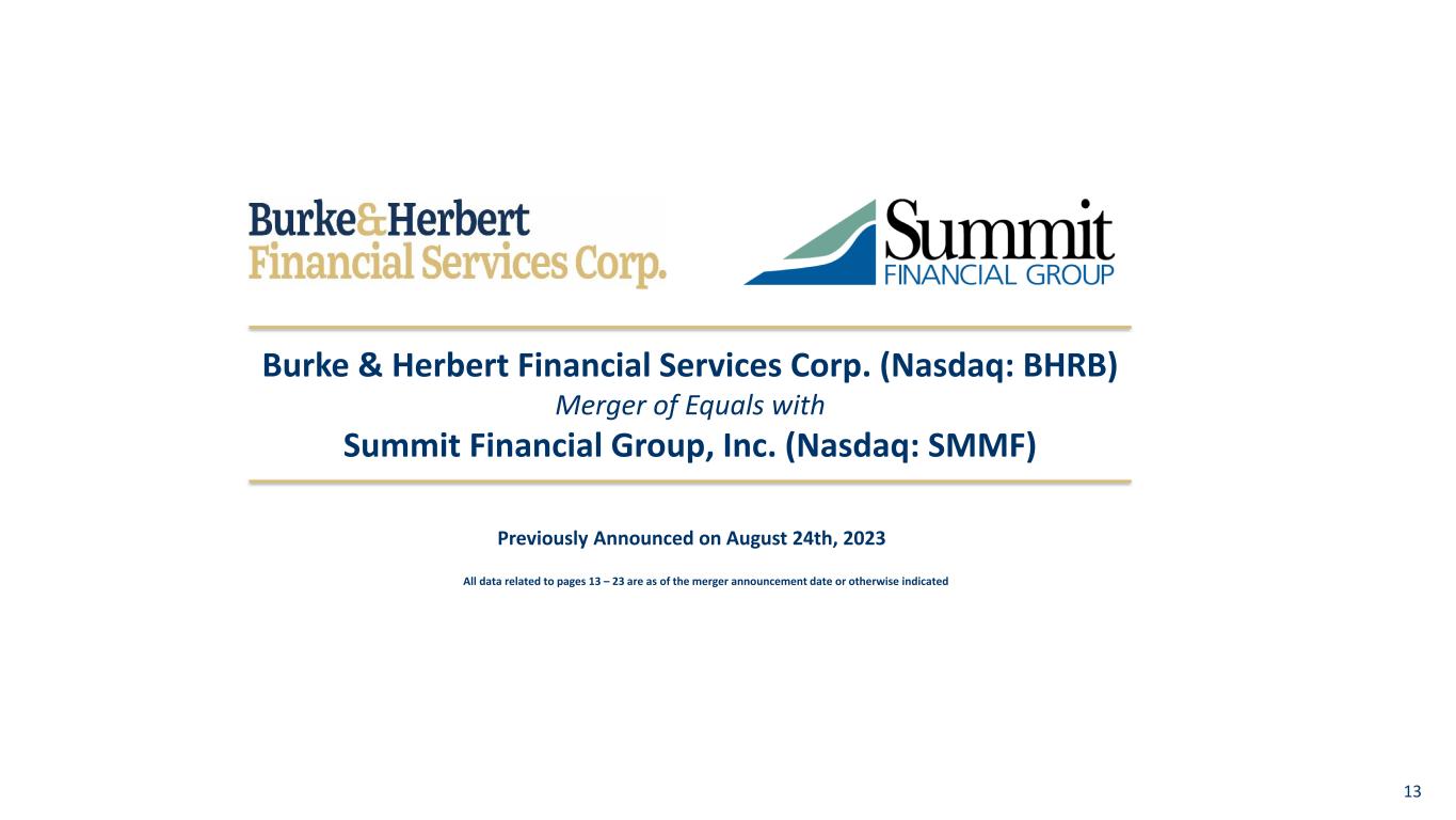 Burke & Herbert Financial Services Corp. (Nasdaq: BHRB) Merger of Equals with Summit Financial Group, Inc. (Nasdaq: SMMF) Previously Announced on August 24th, 2023 13 All data related to pages 13 – 23 are as of the merger announcement date or otherwise indicated